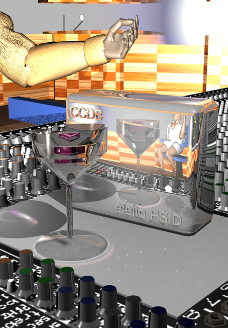 personagem Arqueu; a figura refletida à direita no aparelho de efeito PSID é do
