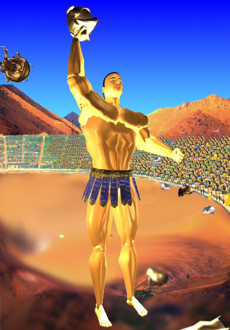 remanescentes, o gigante arrebata o elmo, eleva-o na destra,