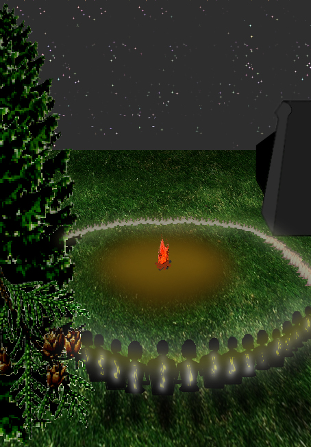 Vasto relvedo. Densa mata à esquerda. Pequeno templo em