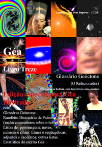 Géa é UM só livro, com doze livros-volumes e deve ser lida a partir do Livro Primeiro. Leitura para adultos, tem doze volumes de texto e um volume de glossário-dicionário (chamado Livro Treze). Cada volume de texto possui perto de duzentas e cinqüenta páginas. O Livro Treze tem mil páginas, você o pode BAIXAR GRÁTIS em PDF, salvá-lo em seu computador e ficar com ele para consultar indefinidamente, após comprar o tempo para leitura on-line - mas não deve distribuir, porque é propriedade do autor. Cada livro de texto contém sessenta e duas ilustrações criadas por CCDB, a maioria em computação gráfica tridimensional. O prefácio é de Sergio Sacco e você também pode baixar grátis em PDF. Para quem afirma que "menos é mais", informo: Géa é MAIS! E digo com frase própria: "Quando mais é composto daqueles menos que são mais, mais é muito mais que menos!" Entre inúmeras qualidades que são "mais", o léxicon em Géa é de trinta mil vocábulos, e isso é o dobro do de Willimam Shakespeare em toda a sua obra e seis vezes o de Camões em "Os Lusíadas". Quantidade não sinonimiza (mas indica) qualidade. Confira a qualidade de Géa, lendo-a! Quando baixar o Livro Treze, meça o longo tempo de download e compare com o velocíssimo acesso aos livros aqui apresentados para leitura on-line!