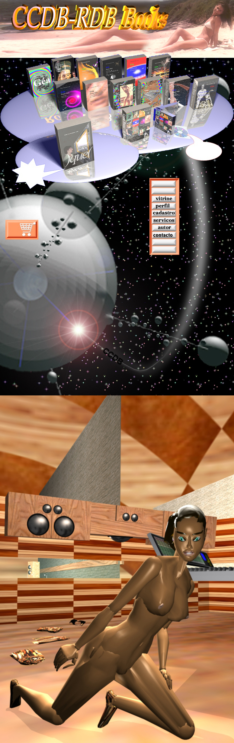Clicando na ilustração, ela aparecerá em página separada de seu browser. Se este for o Windows Internet Explorer; passando o mouse sobre o canto inferior direito da imagem, surgirá um quadrado com setas que, se clicado, ampliará a imagem ao tamanho natural, de alta resolução - caso não veja o quadrado, clique sobre a imagem e, se necessário, aguarde um pouco. Essa página mostra como poderia ser a de uma loja virtual onde os livros CCDB-RDB se vendessem, impressos ou eletrônicos, e é mera sugestão a editores - onde as iniciais CCDB e RDB são propriedade de Cláudio César Dias Baptista e Rafael Borges Dias Baptista, tal como as imagens - registradas na Biblioteca Nacional, pois pertencem à obra ilustrada dos autores. A modelo na foto é Dalgiza - cuja imagem tem todos os direitos reservados. As figuras dos livros e CDs presentes na ilustração são apenas pequena parte das que poderiam estar numa loja virtual de verdade, pois mostram somente os livros da obra Géa não-ilustrada, faltando os de Géa Ilustrada e todos os outros, que você pode conhecer neste site; por exemplo, a partir da página Arquétipo, repleta de capas de livros e outras figuras ativas, cada qual um link.