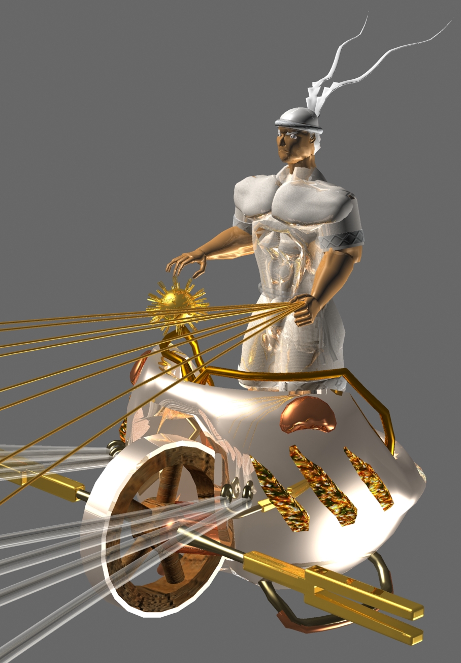 Alfos pilota sua quadriga de duelo, do tempo em que os carros eram puxados por animais multípedes chamados "monoceros"; e, não, por turbinas, como nas motoquadrigas atuais - por exemplo, a de Umglad. Os monoceros não são os monocerontes (ou unicórnios) da lenda terráquea; sim, poderosos bicharocos de tração que se parecem com casquinhas cônicas de sorvete, cheias de pernas como um camarão - e suas cabeças emitem luz. Você pode ver ilustrações de monoceros em meu site e ler-lhes a descrição nos meus livros, no mesmo site.