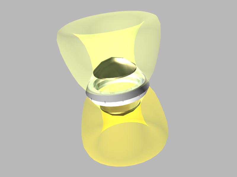 Na figura acima, o vôo se dá no rumo da parte mais espessa dos iônelos. Isso é o contrário do que foi exposto neste site, com auxílio do exemplo do caroço de azeitona premido entre o polegar e o indicador. O comandante da Laranja obtém essa inversão do vôo mudando o sentido do fluxo de ar criado pelos iônelos: onde havia compressão, passa a existir sucção; onde a nave era empurrada, passa a ser puxada.