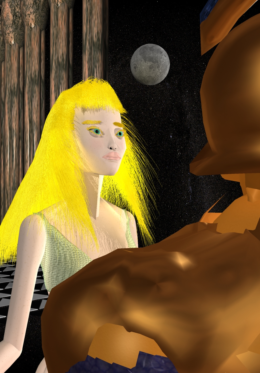 Na ilustração acima, Únia faz o papel da deusa, pois até as deusas se deslumbram com sua beleza e ela se ajusta à perfeição nesta imagem. A adolescente Únia conheceu o jovem Clausar quando este viajou até a fazenda São Umóvão, onde Únia morava. Isso foi muito antes de Clausar cruzar a Constelação da Telária em busca de sua súbita paixão, a bailarina Ansata, que ele não sabia ser sua filha Ky, levada de casa com dois espectros (anos) de idade. Foi muito antes também de Clausar ter sua primeira esposa, Badiú Maboa e de, já separado de Badiú, encontrar o beldo (amor) de sua gédia (vida) ao descobrir a magnífica Gia. A fazenda São Umóvão situava-se (e ainda se situa) em Selvespessa, um estado do país Teruz, planeta Géa, parecido com o estado que, naquele tempo, se chamava Mato Grosso e hoje é o Mato Grosso do Sul, no Brasil, planeta Terra. Uma das divisas da fazenda São Umóvão é o Ribeirão Liquazul, que supera em beleza os rios translúcidos na região de Bonito, ora famosos, em Mato Grosso do Sul - tal como o Córrego Betione, quase desconhecido tributário do rio Miranda, também os supera com seus ambientes miríficos, onde Deus prefere descansar e pintar a paisagem em imensa Paz. Tal como o Córrego Betione, na Terra; o Ribeirão Liquazul, no planeta Géa, tem dezenove cachoeiras. Acima e abaixo de cada uma delas há piscinas de água transparentíssima, sobre o leito pétreo. Quando Rá (o sol de Géa) está no zênite, ao meio-cromat (meio-dia); quem se deitar num galho forte, que se inclina e horizontaliza sobre o Ribeirão Liquazul, e olhar para a líqua (água) lá embaixo, não verá a superfície sombreada pela trônquia (árvore); contemplará, isto sim, os peixes multicolores que voam no vácuo de cristal - até que torvos peixes predadores os atacam e a superfície aquosa surge do vazio, turbulenta! a lampejar escamas. Os juveníssimos Únia e Clausar viveram o romance que se lê no capítulo Selvespessa, Livro Sexto de Géa; seus lábios se aproximaram pela vez primeira na treva da noite nublada, tempestade chegando, e se tocaram, lento e lento como colidem as galáxias. O romance de Únia e Clausar supera em delicadeza, beleza, poesia, forma, vernáculo e conteúdo os romances mais famosos da literatura brasileira - confira e apaixone-se, lendo "Géa", em www.ccdb.gea.nom.br, seção CCDB Livros.