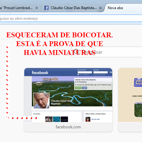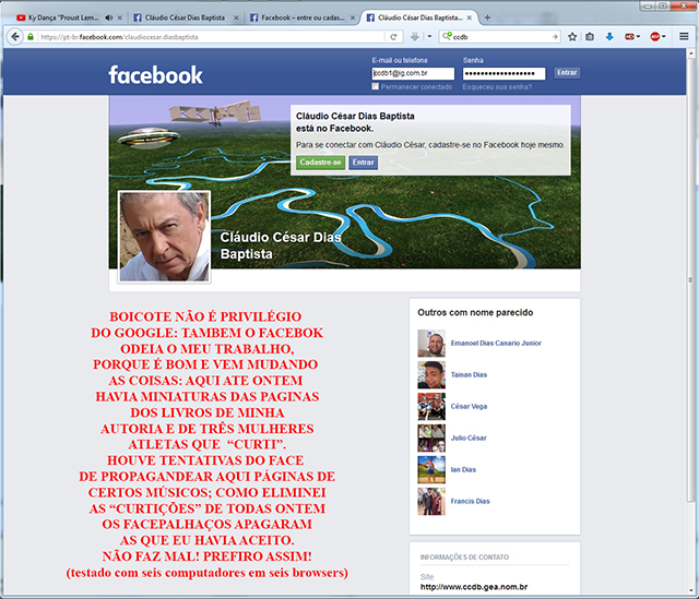 BOICOTE NÃO É PRIVILÉGIO DO GOOGLE: TAMBÉM O FACEBOOK ODEIA O MEU TRABALHO, PORQUE É BOM E VEM MUDANDO AS COISAS: AQUI ATÉ ONTEM NO RESULTADO DA BUSCA POR "CLÁUDIO CÉSAR DIAS BAPTISTA FACEBOOK" HAVIA MINIATURAS DAS PÁGINAS DOS LIVROS DE MINHA AUTORIA E DE TRÊS MULHERES ATLETAS QUE EU “CURTIRA”. HOUVE TENTATIVAS DO FACE DE PROPAGANDEAR AQUI PÁGINAS DE CERTOS MÚSICOS; COMO ELIMINEI AS “CURTIÇÕES” DE TODAS ONTEM OS FACEPALHAÇOS APAGARAM AS QUE EU HAVIA ACEITO (LIVROS E ATLETAS FEMININAS. NÃO FAZ MAL! PREFIRO ASSIM!