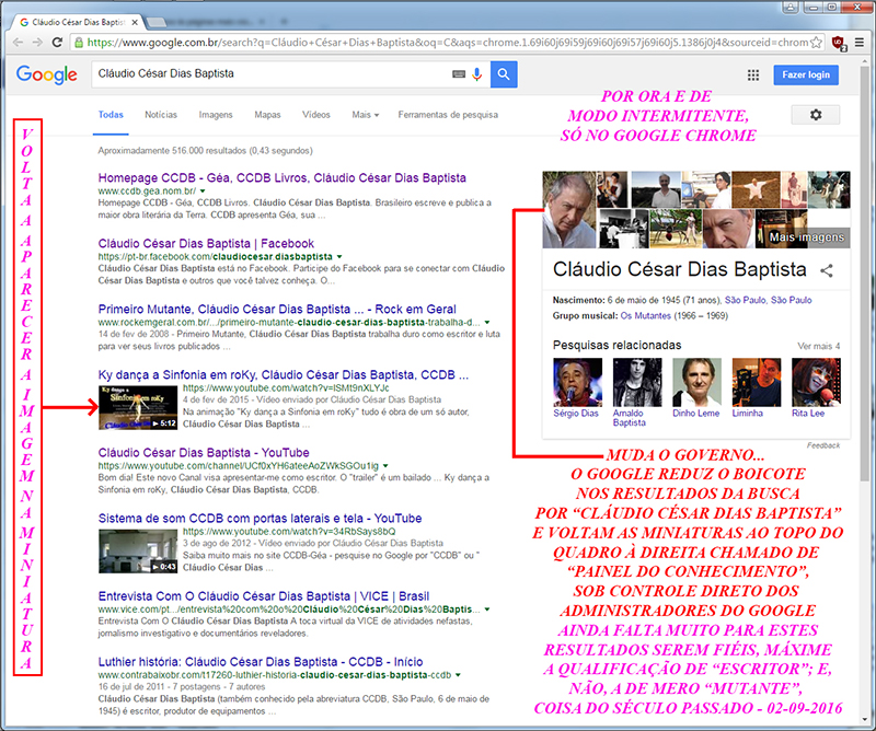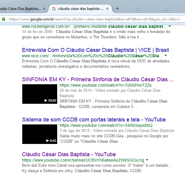 O MAIS RECENTE BOICOTE DO GOOGLE, AGORA NO RESULTADO DA BUSCA POR "CLÁUDIO CÉSAR DIAS BAPTISTA": as miniaturas nos dois vídeos que se destacam na página aparecem em preto. Testado em seis computadores e seis browsers diferentes: iExplorer, Firefox, Chrome, Opera, Safari e Slim. SABE POR QUE ESSE BOICOTE? - POR QUE O MEU TRABALHO É BOM E VEM MUDANDO AS COISAS!!!