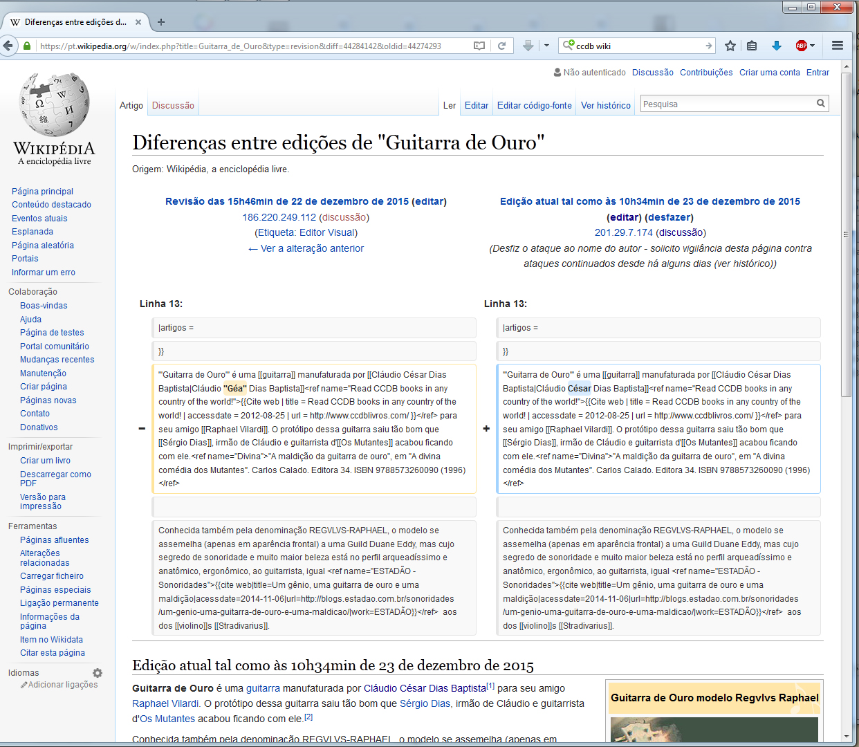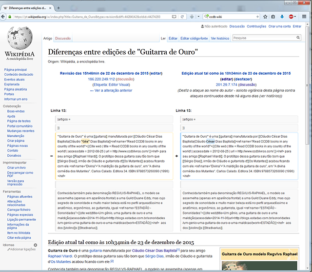 COINCIDÊNCIA? CLIQUE NA IMAGEM ABAIXO E USE A SETINHA DE PONTA DUPLA PARA VÊ-LA EM PÁGINA INTEIRA. MOSTRA A CORREÇÃO DO ÚLTIMO ATAQUE AO NOME "Cláudio César Dias Baptista" NO CÓDIGO-FONTE DA PÁGINA "Guitarra de Ouro", PT WIKIPÉDIA. PARA VER OS ATAQUES, ABRA ESSA PÁGINA NUM BROWSER E CLIQUE NO LINK "Histórico". JÁ SÃO VÁRIOS, RECENTES. MAIS SOBRE OS ATAQUES A MEU TRABALHO E PESSOA, LEIA NO TÍTULO QUE CONTÉM A PALAVRA "CENSURA":http://www.ccdb.gea.nom.br/links_para_as_paginas_mais_visitadas.html - PARA VER ATAQUES NAS WIKIPÉDIAS ENGLISH E PT, BUSQUE "WIKI" NA MESMA PÁGINA.