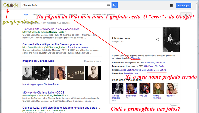 ADENDA: TAMBÉM NOS RESULTADOS DAS BUSCAS PELOS NOMES DE MEUS IRMÃOS E OUTROS, O MEU NOME APARECE GRAFADO ERRADO (E É O ÚNICO ASSIM) PELOS googlepalhaços. - CCDB - 20-08-2016