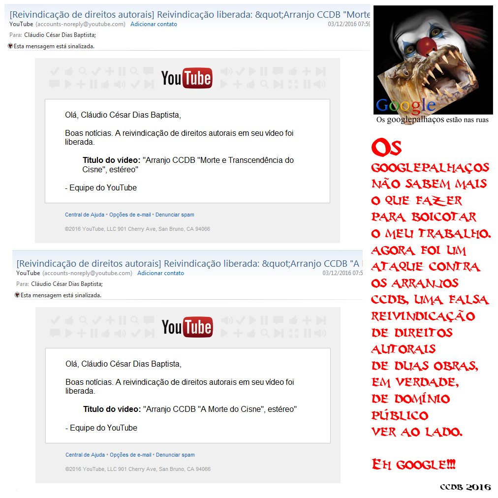 Vale a pena conhecer mais estas duas googlepalhaçadas - e já não é a vez primeira que os palhaços me vêm com isso de falsos direitos autorais. Eles bloquearam ambos os vídeos dos meus arranjos (como fizeram há algum tempo com outro arranjo meu) e foi preciso entrar com uma disputa (que venci) por meio de um complicado procedimento que os palhaços impõem no Youtube - empresa do Google!