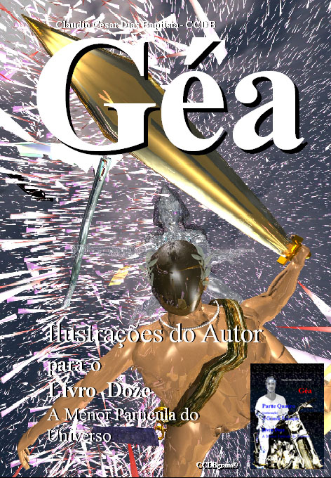 Livro de ilustrações para o Livro Doze de Géa A Menor Partícula do Universo Veja abaixo a belíssima capa do livro eletrônico que o autor de Géa já tem pronto para apresentação a editores, com o intuito exclusivo de publicá-lo impresso em papel! Nesta capa, que reproduz uma das ilustrações do Livro Doze, você vê uma cena da luta de Clausar, empunhando a Ecoespada, contra o Desrelacionador, o qual porta a foice e assume a imagem de Oég, a Morte. Falta um terço da lâmina da foice, arrancado durante a luta do Desrelacionador versus Arqueu. Também não se vê o írio (olho) direito do Desrelacionador, perfurado por Alfos. Saiba tudo a respeito e muito mais, lendo Géa! Você sabia que cada formato dos livros de ilustrações possui capa própria, semelhante ou não à dos demais? Neste site só foram apresentadas as capas do primeiro formato! Todas as outras capas estão prontas para serem publicadas e à disposição dos editores das inúmeras mídias, com resolução maior e aspecto melhor do que se pode exibir aqui. O mesmo acontece com as ilustrações em si: neste sítio apresenta-se