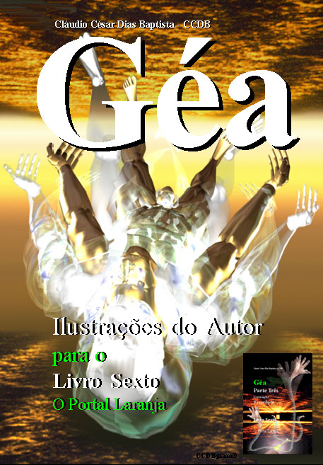 O Portal Laranja Veja abaixo a belíssima capa do livro eletrônico que o autor de Géa já tem pronto para apresentação a editores, com o intuito exclusivo de publicá-lo impresso em papel! Texto de Géa ao qual se liga esta ilustração: - Ultriz drágea laranja... Nem foi mordida... e vinga-se neste compasso atroz... Dois milespectros, Ra-El... O ritmo expande-se... é um só com o espaço... Estou... Meus braços... e pernas... alongam-se... Segurem... Minha mão direita é imensa nas suas, Ra-El... Meu braço transparente estica-se... como o frátax de laboratório aquecido e repuxado... Estou perdendo Você na distância infinita, Ra-El. Junto me leva a mão direita... Só o delgado filete de meu braço nos mantém unidos; e desta vez é Você, Kier... Vai para longe com minha outra mão... Não adianta mais segurarem... Estou só... Só, não... Inexiste solidão... Só: inteiramente por minha conta...
