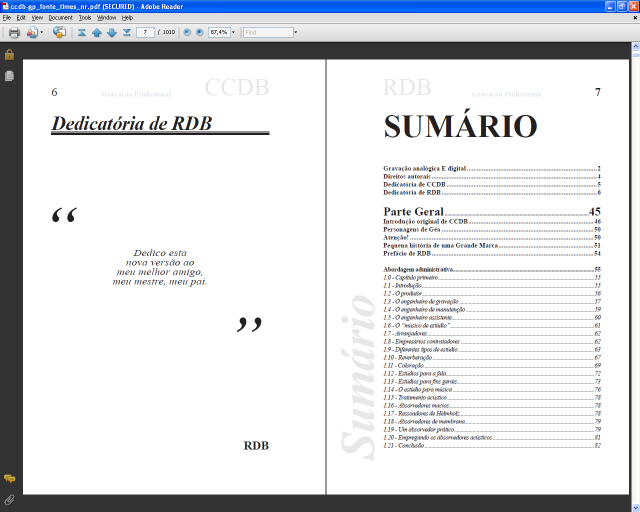 Esta página o apresenta aos EDITORES, para que se interessem em publicá-lo. AUTÊNTICO, SEM PLÁGIOS, O MAIS BEM ESCRITO LIVRO TÉCNICO DE TODOS OS TEMPOS E, CONQUANTO ATÉ POÉTICO, PLENO DO MAIS ATUAL E COMPLETO CONTEÚDO, NA LINGUAGEM MAIS FÁCIL E CHEIO DE “DICAS” INESTIMÁVEIS, ESCRITO POR QUEM USOU EM CAMPO, PROJETOU E CONSTRUIU LENDÁRIAS GRANDES MESAS E OUTROS APARELHOS DE GRAVAÇÃO PROFISSIONAL! Nota de rodapé, versão de 2009, página 727 de CCDB - Gravação Profissional: ‘(1) eu ouço impressões digitais - em todos os sentidos da palavra “impressões” - para testar a resposta de meus ouvidos às altas freqüências, esfregando suavemente os dedos entre si junto às orelhas e comparando os agudos nos dois ouvidos. É melhor que ouvir estrelas... - CCDB 2009’ IMPORTANTE!!! SENHOR EDITOR: O conteúdo deste livro não se limita à gravação profissional analógica e digital. Ele cobre vasta área do áudio, porém se centra perfeitamente no tema de seu título. E não é simplesmente o "básico", os primeiros degraus: ele percorre desde o início até o fim - da superfície a sua maior profundidade - TODA a matéria cujo título determina, e vai além.