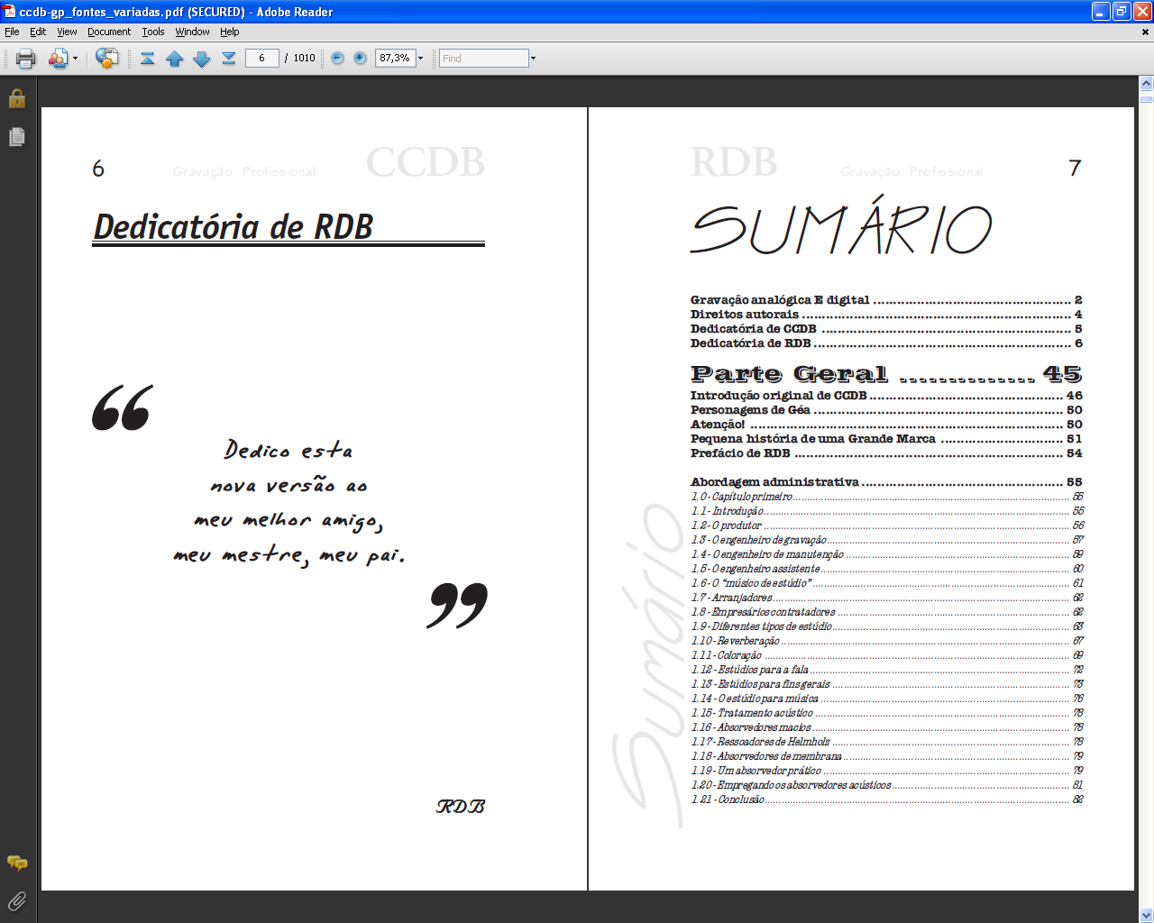 NOVÍSSIMA AMOSTRA COM AS PRIMEIRAS SETENTA PÁGINAS DA VERSÃO ATUALIZADA EM 2009 de CCDB - Gravação Profissional! (PDF 18,73MB) - Esta amostra apresenta a capa e as sessenta e nove páginas seguintes, incluindo o Sumário, fotos magníficas e boa parte do primeiro capítulo de CCDB - Gravação Profissional. A amostra foi criada com a versão de fontes VARIADAS de CCDB - Gravação Profissional, cujo design é fruto do magnífico trabalho realizado por meu filho, o co-autor Rafael Borges Dias Baptista (RDB), com diagramação perfeita e cuidadosa escolha de fontes. Embora na página 4 desta amostra não esteja escrito, aparecerá no livro que vai para os editores publicarem a frase derradeira da página: "CCDB atualizou novamente este livro em Janeiro de 2009."