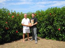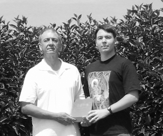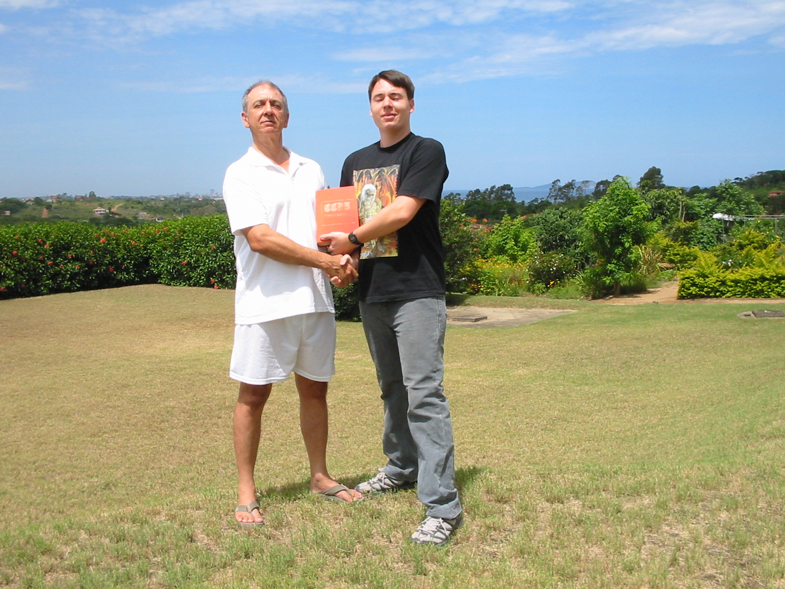 Foto dos Autores, CCDB e RDB, para a última página de CCDB - Gravação Profissional. Na foto, ambos apresentam o primeiro exemplar da primeira edição (artesanal) do livro. A foto é de autoria de RDB, por meio do temporizador da câmara digital emprestada por Alexandre Señorans. O local da fotografação é a residência dos autores, próxima das Montanhas de Cristal e da Base Galáctica de Géa (vide ilustrações da obra, neste site). Para voltar da página "Montanhas de Cristal", caso a acesse com o link recém-mostrado, use a seta "voltar" do browser e estará neste mesmo ponto desta página. O texto (logo abaixo em cor castanha), da página