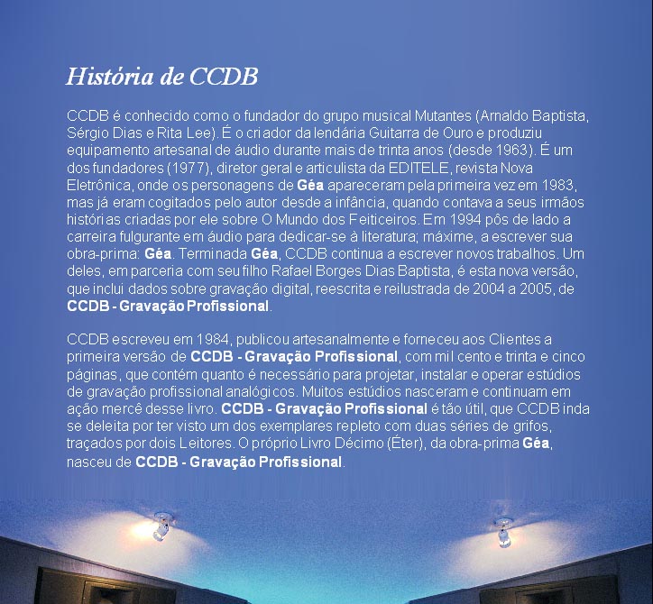 Acima (em baixa resolução para não pesar neste site), eis a CAPA da nova versão*de CCDB - Gravação Profissional ©. A foto é do Zod Studio, de Sérgio Dias Baptista, onde se vê, embutida no console confeccionado por ele, a lendária mesa CCDB 44 ®. À esquerda, está a guitarra Stratocaster branca, na qual fica instalada a incomparável parte elétrica ativa CCDB - Guitartrek ®. Apoiada no console, a excelsa Guitarra de Ouro II, a Regvlvs Modelo Raphael número II, restaurada por mim. * Esta, aqui ofertada aos editores, se diz "nova versão" de CCDB - Gravação Profissional porque escrevi uma primeira versão, originalmente destinada a tornar-se um curso de gravação e áudio e ser publicada na revista Nova Eletrônica. Porém, a revista foi extinta por seu proprietário antes de ser publicado tal curso, e eu o transformei na primeira versão de CCDB - Gravação Profissional, que forneci a preço de custo aos Clientes do Laboratório CCDB em quantidade limitadíssima (apenas duzentos e um exemplares - tenho os nomes de todos os Clientes que os adquiriram e as datas da aquisição - portanto, dada a mínima exposição a esse público fechado, A OBRA É INÉDITA, máxime nesta nova versão, MUITO AMPLIADA E ATUALIZADA). A nova versão foi tão atualizada e aumentada que se pode considerar inédita, porque a quantidade de livros artesanais fornecida aos meus Clientes não é significativa, perante a tiragem que espero da editora a qual comigo e meu filho contratar esta nova versão. A versão original de CCDB - Gravação Profissional tinha mil cento e trinta e cinco páginas, das quais doze por cento contavam as histórias que, com o já publicado por mim na Nova Eletrônica, formavam o começo da saga das personagens de Géa. Essa parte, com histórias e personagens, foi retirada da nova versão, que - embora contenha muito mais matéria (acrescentada por mim e meu filho durante a reescrita da obra), com o tamanho menor dos caracteres e das margens, dá à nova versão "apenas" mil e dez páginas. - CCDB