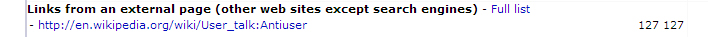MEDITE NESTE NOVO DADO A estatística abaixo mostra parte da visitação de meu site, colhida em 30 de Junho de 2011 com o aplicativo Awstats, a partir de uma página externa. Compare o que nela encontrar com o código-fonte da discussão, mais acima nesta página, e tire suas próprias conclusões - o dado encabeça essa lista, com cento e vinte sete visitas ao meu site, por uma única determinada pessoa, em Junho.