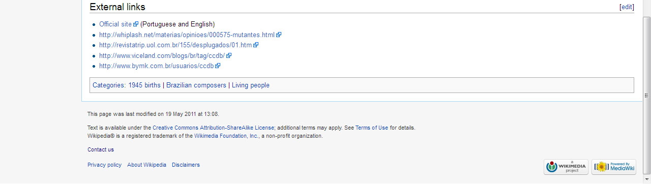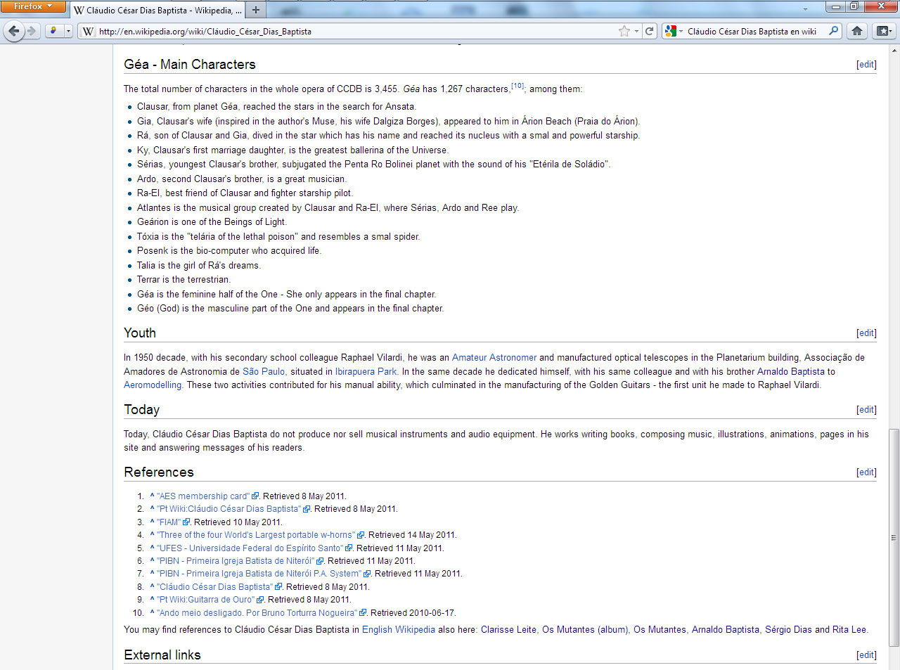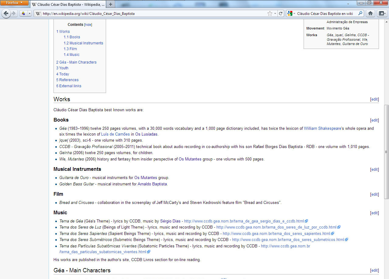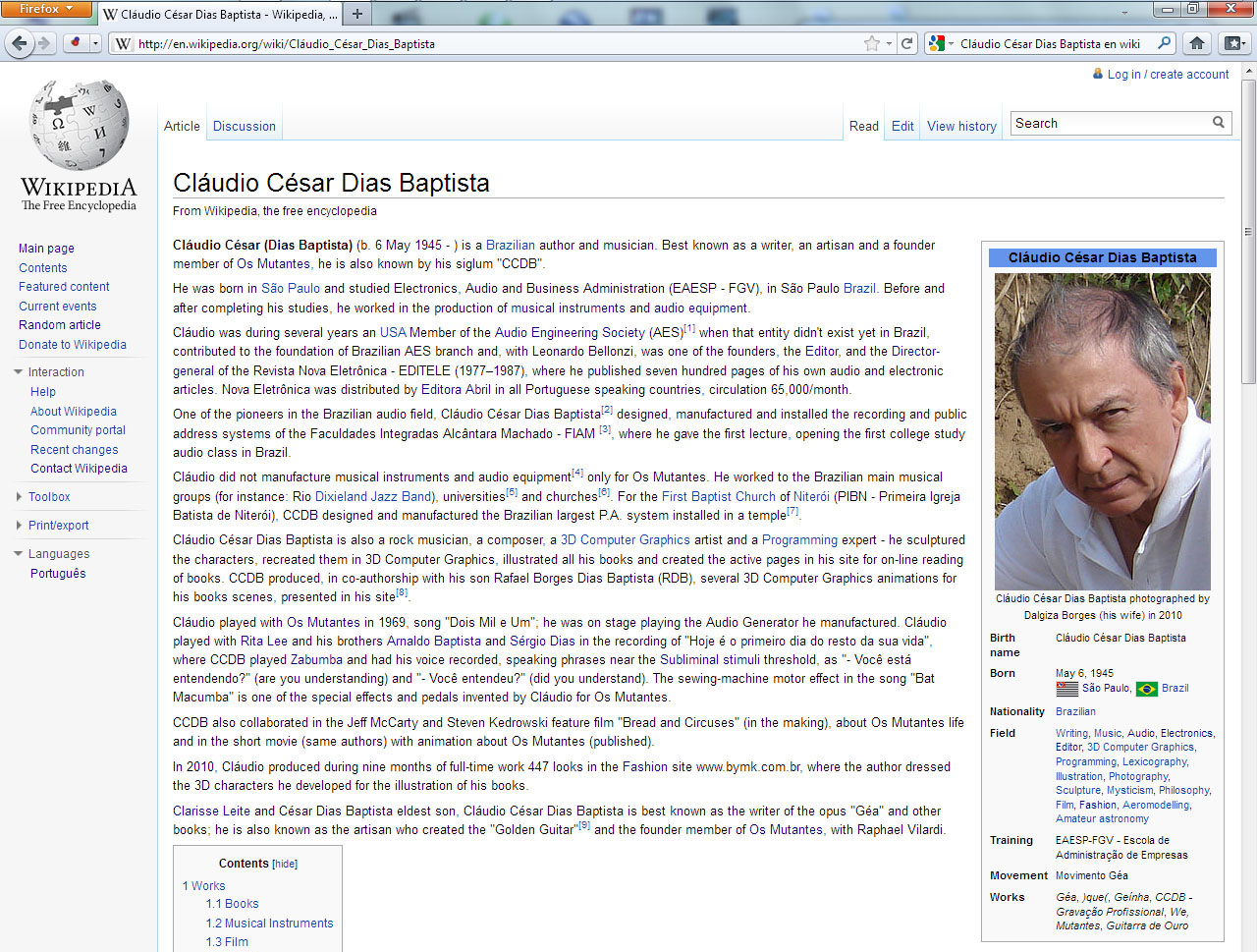 APAGANDO A HISTÓRIA DO BRASIL Um dos brasileiros que atacaram as páginas “Géa” e “Cláudio César Dias Baptista” na English Wikipedia (En Wiki) apagou nas páginas “Os Mutantes”, “Rita Lee” e em todas as páginas dos álbuns dos Mutantes (que permanecem na En Wiki) a seguinte parte da história do conjunto que Raphael Vilardi e eu criamos (eis a cópia do código-fonte da parte apagada): "The musical instruments of Os Mutantes, as the Golden Guitar (Guitarra de Ouro) and special sound effects and pedals, as the sewing-machine motor effect in the song "Bat Macumba" and the Guitar Synthesizer Sérgio played in Tudo Foi Feito Pelo Sol were all created by [[Cláudio César Dias Baptista]] - CCDB, the elder brother of Arnaldo and Sérgio. With Raphael Vilardi, Cláudio founded the musical group "The Thunders", first of all groups which resulted in Os Mutantes. The Golden Guitar (Guitarra de Ouro) can be heard in the "Os Mutantes" album and in many other albums of the same group. Today Cláudio is best known as a writer, author of the opus [[Géa]] (with twice the lexicon of [[William Shakespeare]] whole opera) and several other books, but he still helps Os Mutantes furnishing circuit information to the new guitars of [[Sérgio Dias]]." Na página “Rita Lee” o parágrafo apagado mencionava também o teremim que para ela criei e a minha participação no LP “Hoje é o Último Dia do Resto da Sua Vida”, em que toquei zabumba, fiz comentários que se ouvem na gravação, LP esse cujo “som” (como está escrito na capa do LP e no folhedo do CD) foi de minha autoria. É proibido ter léxicon duas vezes o de William Shakespeare na En Wiki. É proibido ser escritor quando se é um dos Mutantes. Não “é proibido proibir” na En Wiki. Pergunta: eu me tornei persona non grata à En Wiki por causa desta página (a que você lê agora) e destas outras páginas (CCDB na Pt Wikipédia e CCDB na Pt Wikipédia versão antiga) em meu site e por esse motivo meu nome e obra são apagados lá? Ou esta página (a que você lê agora) e as páginas dos links acima nasceram depois que brasileiros atacaram as páginas Pt Wiki e da En Wiki onde meu nome e obra apareciam e minha história era contada, parte da História do Brasil que tais brasileiros apagaram? - CCDB 19-06-2011.