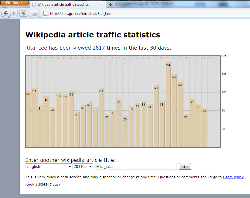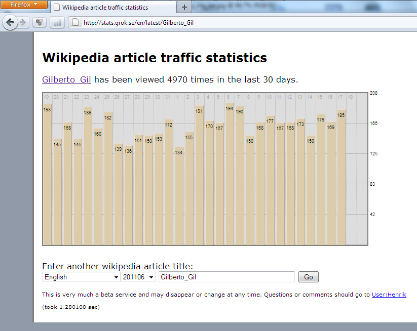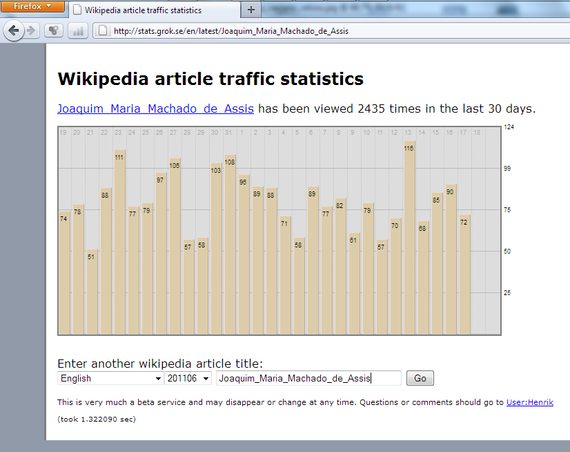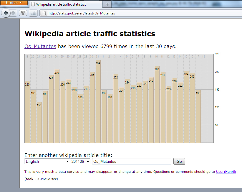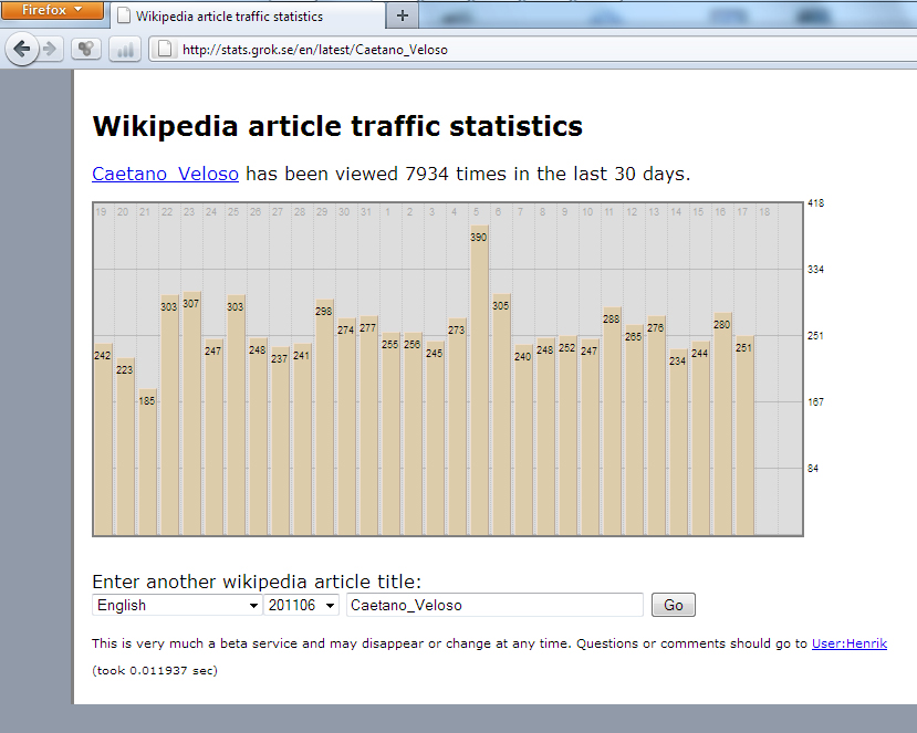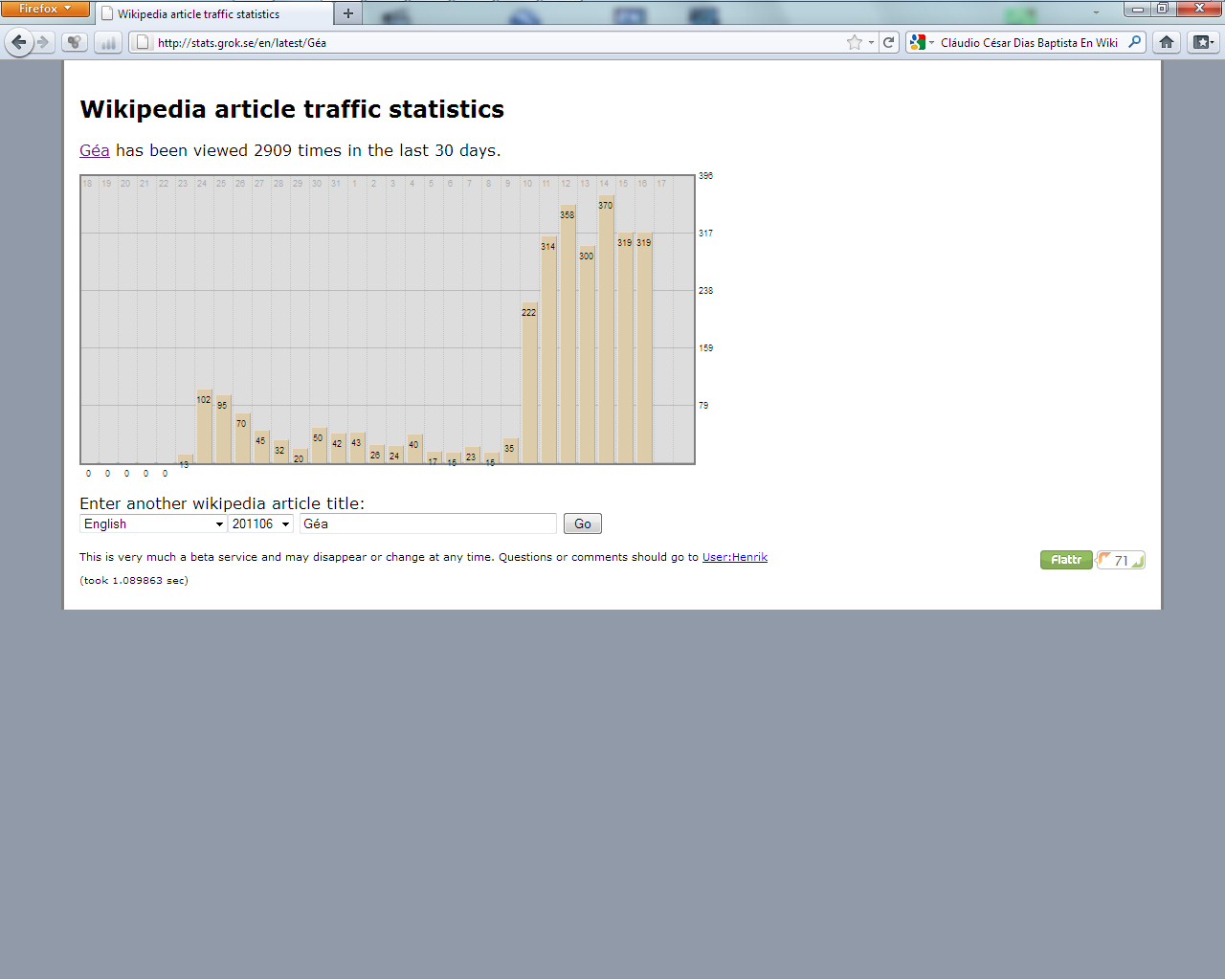 Eis, nos dois próximos quadros abaixo, a estatística de visitação das páginas “Géa” e “Cláudio César Dias Baptista” na En Wiki, desde que foram criadas por alguém que não eu, até o dia anterior ao seu apagamento. Os administradores da En Wiki não permitiram que tais páginas permanecessem, talvez por ser proibido possuir léxicon duas vezes maior do que o de William Shakespeare e ter sido membro dos Mutantes para ter página de livro e de autor na En Wiki. As estatísticas da página “Géa” e/ou da página “Cláudio César Dias Baptista” superam as estatísticas das páginas de Os Mutantes, Caetano Veloso, Gilberto Gil, Rita Lee e Machado de Assis! |
