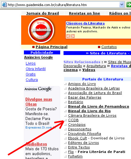 Estar na página de "Sites de Literatura", do Guia de Mídia, é uma honra para qualquer site! Para este inclusive, e para CCDB Livros, que faz parte deste site.