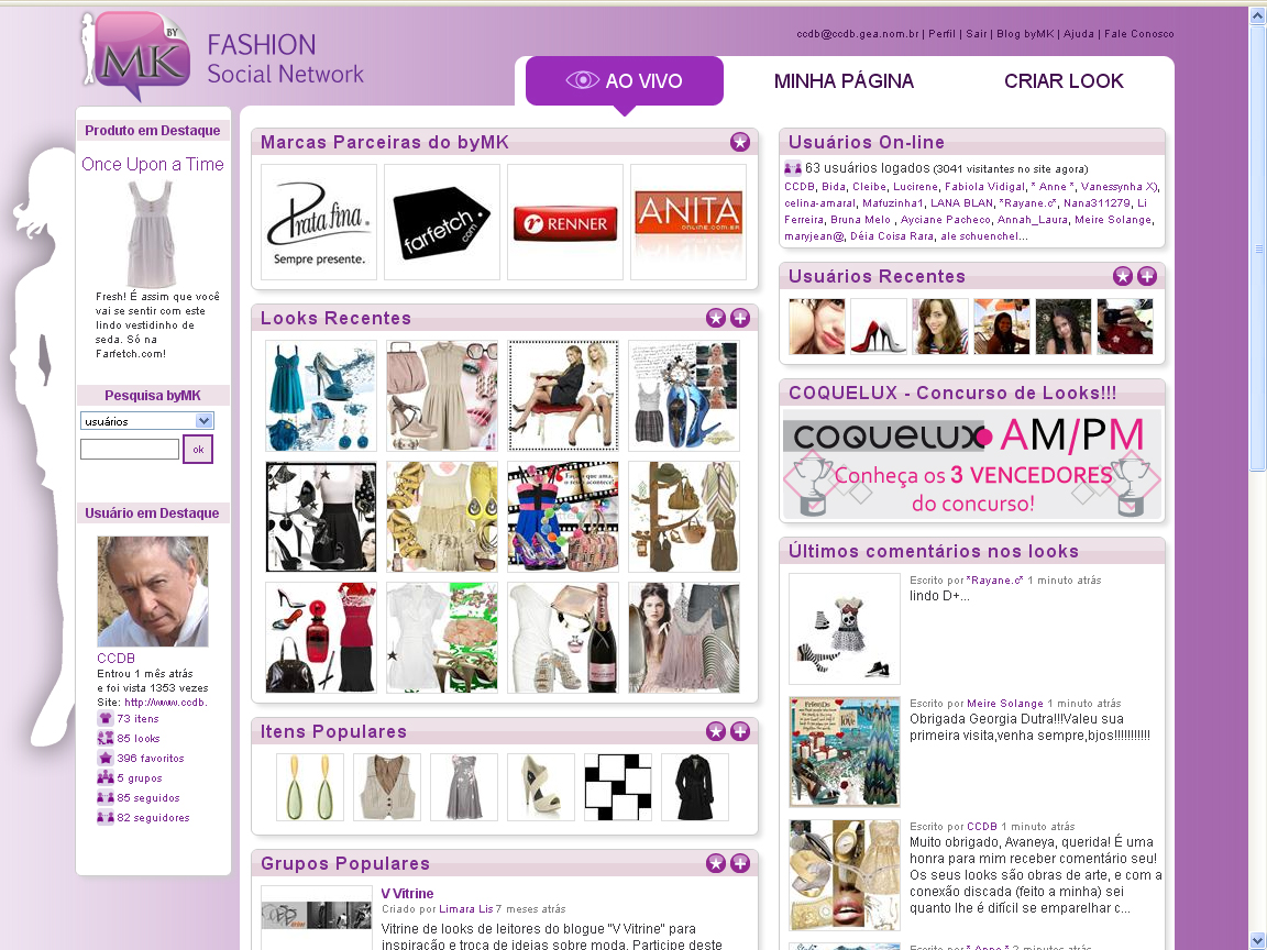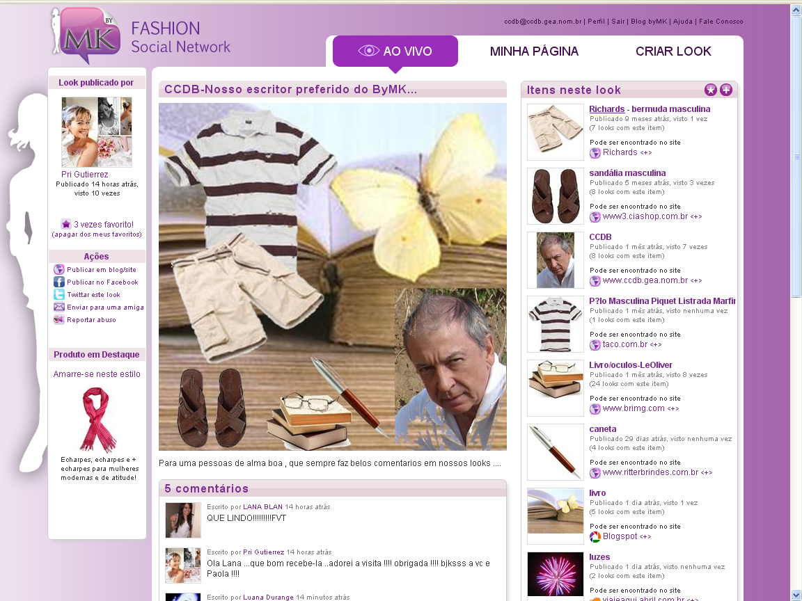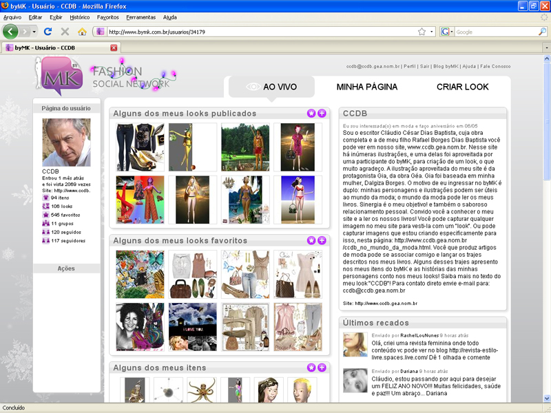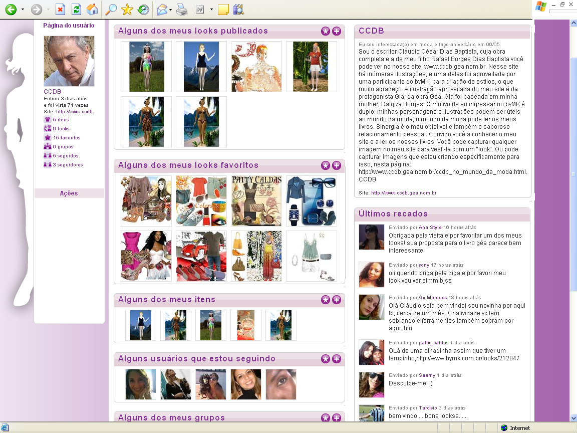 No canto inferior esquerdo, na página "AO VIVO", uma página geral do próprio site byMK que reproduzo logo abaixo deste texto, você vê o meu "avatar" com a minha face estampada, na seção do destaque do site! Veja a visitação estonteante que venho obtendo em minha página byMK! Há quem esteja há meses no byMK, criando bons looks, e não recebeu sequer cem visitas. São já oitenta e duas pessoas me seguindo, atentas aos meus looks. No canto inferior direito, você vê a miniatura de um dos últimos looks que criei, ao lado da qual vai meu agradecimento por um dos comentários que nele deixaram. |
