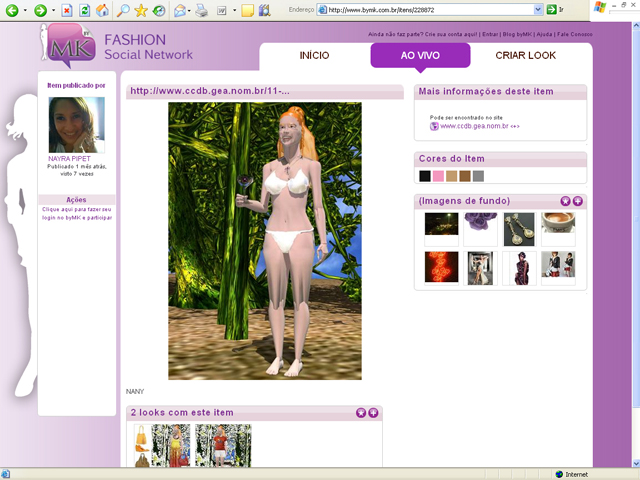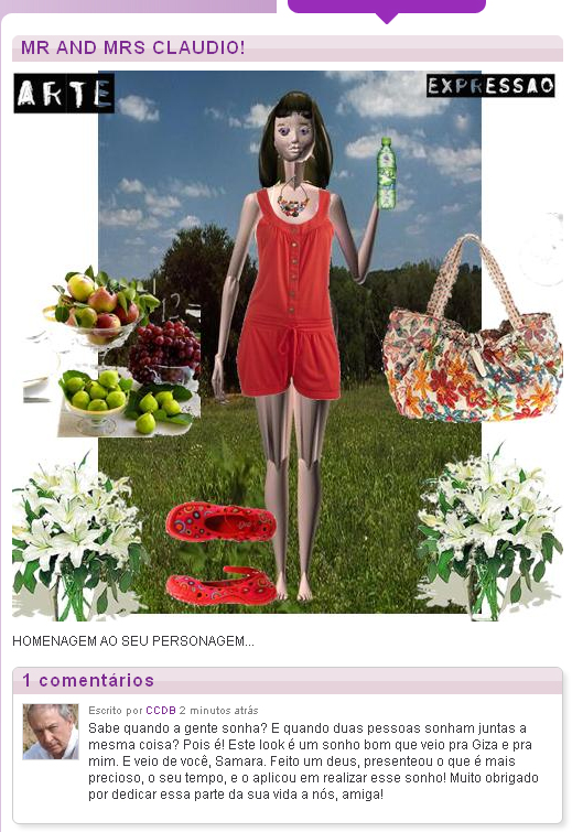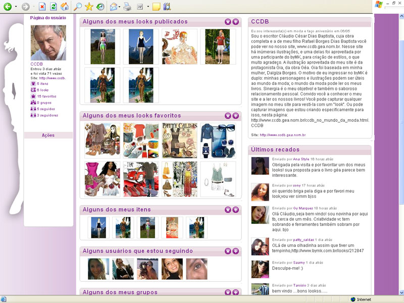Depois de descobrir, via pesquisa no Google, que Nayra Pipet havia criado um "look" a partir de uma personagem minha, cuja imagem capturou neste site (www.ccdb.gea.nom.br), ingressei no byMK e a recepção me surpreendeu! Muito obrigado, gente do byMK! Mulheres e homens interessados em moda! Um site que promove o mundo "fashion" em perfeita sinergia com o Movimento Géa! - CCDB |