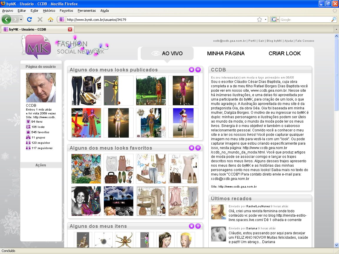 Meu objetivo não é disputar lugares na primeira página dos usuários populares ou noutra qualquer do byMK. No byMK há inúmeros profissionais da moda e grandes artistas na criação de looks - respeito a todos eles e também ao iniciante. Meu sucesso no byMK não é o meu objetivo. Meu objetivo não é tão-somente divulgar meus livros no byMK, inserindo resumos das histórias das personagens nos textos sob os looks e vestindo com os itens mercadológicos do byMK as entidades gráficas que criei para ilustrar meus livros e que no byMK os colegas e as colegas chamam carinhosamente de "bonecos". Meu objetivo é, com o sucesso que minhas personagens e os textos das histórias fazem no byMK, comprovar aos editores que meus livros farão o mesmo ou ainda maior sucesso se investirem em lançá-los impressos em papel. - CCDB 19-02-2010 |