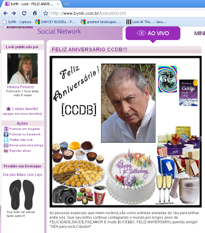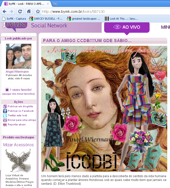 CONTINUA NA PÁGINA DOZE É FÁCIL DESCOBRIR LOOKS QUE SE RELACIONEM COMIGO NO byMK. ASSIM: Entre na página "Ao Vivo", em "Pesquisa byMK" (à esquerda, em cima, na página), escolha "looks" no campo de cima. Então digite "CCDB" no campo de baixo e clique "OK". Aparecerá uma primeira página com miniaturas de looks relacionados ao meu nome, CCDB. Virando as páginas você verá todos eles! ____________________________________________ VOCÊ PODE CONHECER, ATÉ O MOMENTO, QUASE TREZENTOS OUTROS LOOKS, OS DE MINHA AUTORIA, COM PERSONAGENS E RESUMOS DE TEXTOS DOS MEUS LIVROS E OS COMENTÁRIOS DE COLEGAS DE byMK ENTRANDO NO byMK E DIGITANDO "CCDB" NO CAMPO DE BUSCA DE USUÁRIOS! O LINK PARA AS PÁGINAS QUE ACESSAM OS LOOKS FICA À ESQUERDA, EM MINHA PÁGINA DE byMK. ____________________________________________