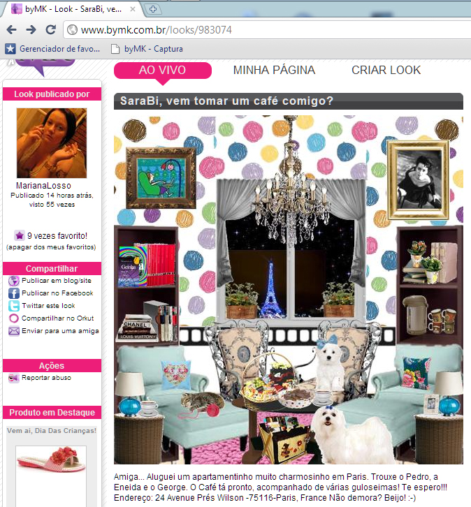 O melhor meio de conhecer esse sucesso, porém, é nas páginas interativas do byMK, que agora mudou de site e se chama FASHION.ME. Entre no byMK por meio deste link http://www.bymk.com.br/usuarios/ccdb e será redirecionado para a minha página, no FASHION.ME - ou entre direto na minha página, no FASHION.ME, por meio deste link: http://fashion.me/users/ccdb. Estando na minha página de usuário, clique no link para ver os meus looks e confira!