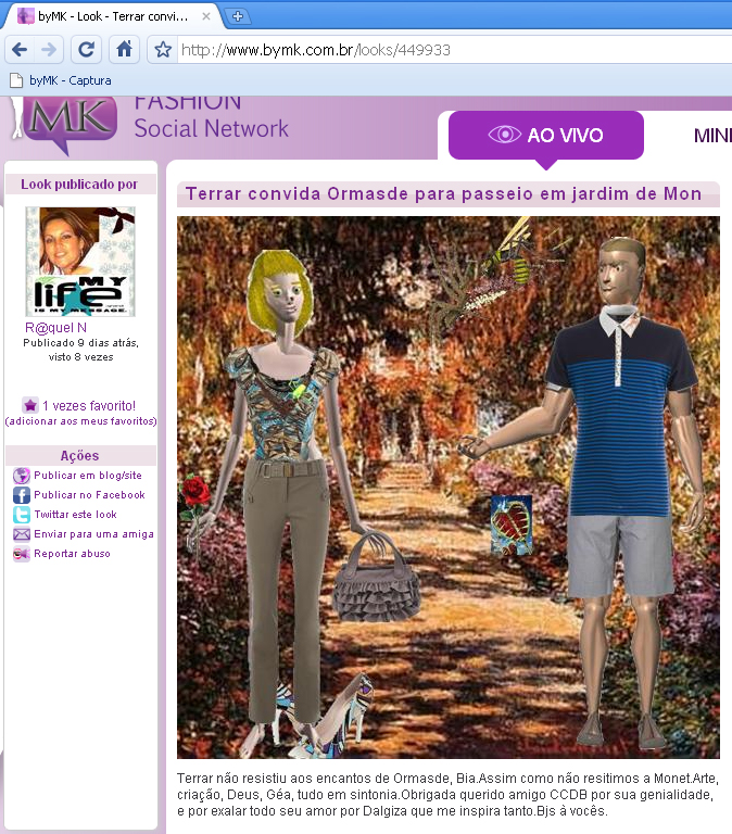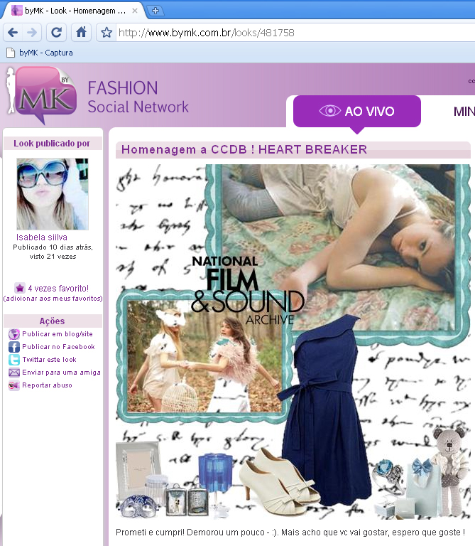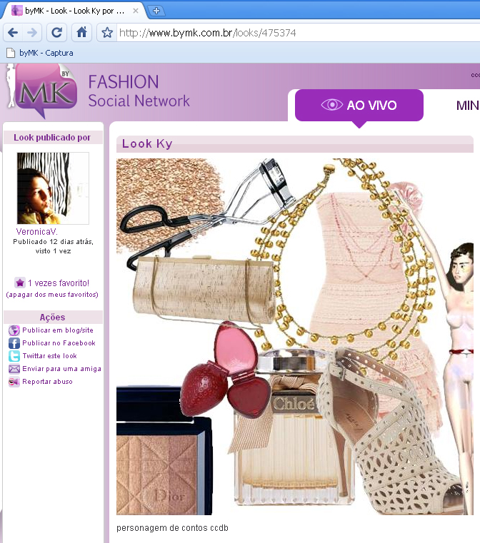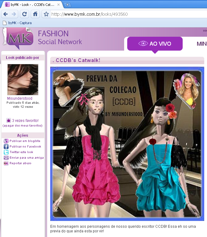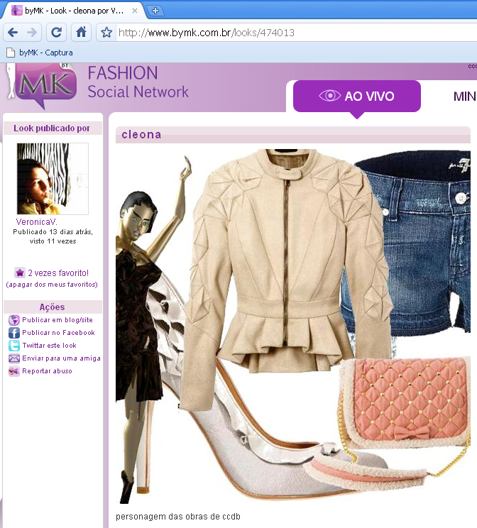 O melhor meio de conhecer esse sucesso, porém, é nas páginas interativas do byMK, que agora mudou de site e se chama FASHION.ME. Entre no byMK por meio deste link http://www.bymk.com.br/usuarios/ccdb e será redirecionado para a minha página, no FASHION.ME - ou entre direto na minha página, no FASHION.ME, por meio deste link: http://fashion.me/users/ccdb. Estando na minha página de usuário, clique no link para ver os meus looks e confira!