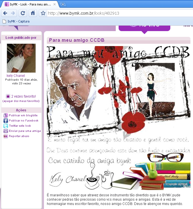 CONTINUA NA PÁGINA TRÊS É FÁCIL DESCOBRIR LOOKS QUE SE RELACIONEM COMIGO NO byMK. ASSIM: Entre na página "Ao Vivo", em "Pesquisa byMK" (à esquerda, em cima, na página), escolha "looks" no campo de cima. Então digite "CCDB" no campo de baixo e clique "OK". Aparecerá uma primeira página com miniaturas de looks relacionados ao meu nome, CCDB. Virando as páginas você verá todos eles! ____________________________________________ VOCÊ PODE CONHECER, ATÉ O MOMENTO, QUASE TREZENTOS OUTROS LOOKS, OS DE MINHA AUTORIA, COM PERSONAGENS E RESUMOS DE TEXTOS DOS MEUS LIVROS E OS COMENTÁRIOS DE COLEGAS DE byMK ENTRANDO NO byMK E DIGITANDO "CCDB" NO CAMPO DE BUSCA DE USUÁRIOS! O LINK PARA AS PÁGINAS QUE ACESSAM OS LOOKS FICA À ESQUERDA, EM MINHA PÁGINA DE byMK. ____________________________________________