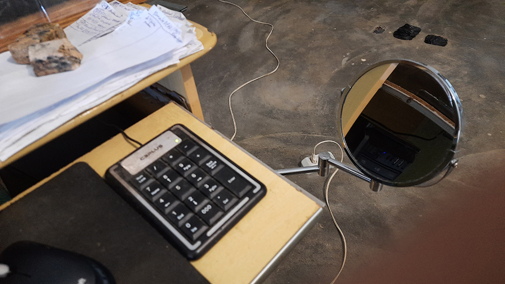Precisei trocar o chassi do meu computador de Internet e colocá-lo no mesmo lugar, sob a mesa, onde estava o antigo. Porém, só achei com o LED do HD e o botão de ligar no alto. O antigo os tinha em baixo, sempre visíveis da minha cadeira - e LEDs virtuais não fazem o serviço. Tive a idéia de comprar um espelho do tipo que se usa no banheiro, para barba, maquiagem, etc., e o coloquei onde se vê na imagem acima. Agora, movendo a mão direita ao contrário da imagem, é fácil ligar e desligar o computador e vêem-se os LEDs de "ligado" e do HD sem ter de fechar a gaveta que sustenta o teclado e os esconde. Melhor e menos trabalhoso do que instalar o LED ou um substituto na parte inferior do chassi, idem o botão de ligar-desligar o computador. Na foto, aparece o LED azul de "ligado"; o do HD está em repouso mas fica junto a esse e é muito visível, bastando olhar no espelho. Foi bem barato o custo do espelho e não deu muito trabalho fixá-lo in loco - faz mais ou menos quatro meses que ali está, bastando limpá-lo quando se empoeira. O mouse na foto é da Microsoft, necessário no Windows 10 (onde programas de terceiros não funcionam bem) para usar duplo clique na "rodinha" com o aplicativo INTELLIPOINT PARA MOUSE MICROSOFT, que só funciona em mouse Microsoft... As notas em cima da mesa são sobre quem está lendo os livros em CCDB Livros. A sala é a mesma onde filmei Dalgiza dançando o meu Arranjo da Tocata e Fuga em Ré Menor de Bach e criei todas as minhas animações, os nossos sites e onde se deu o famoso Assalto - você pode achar tudo isso e muito mais, até ler todos os livros inteiros, percorrendo este site.