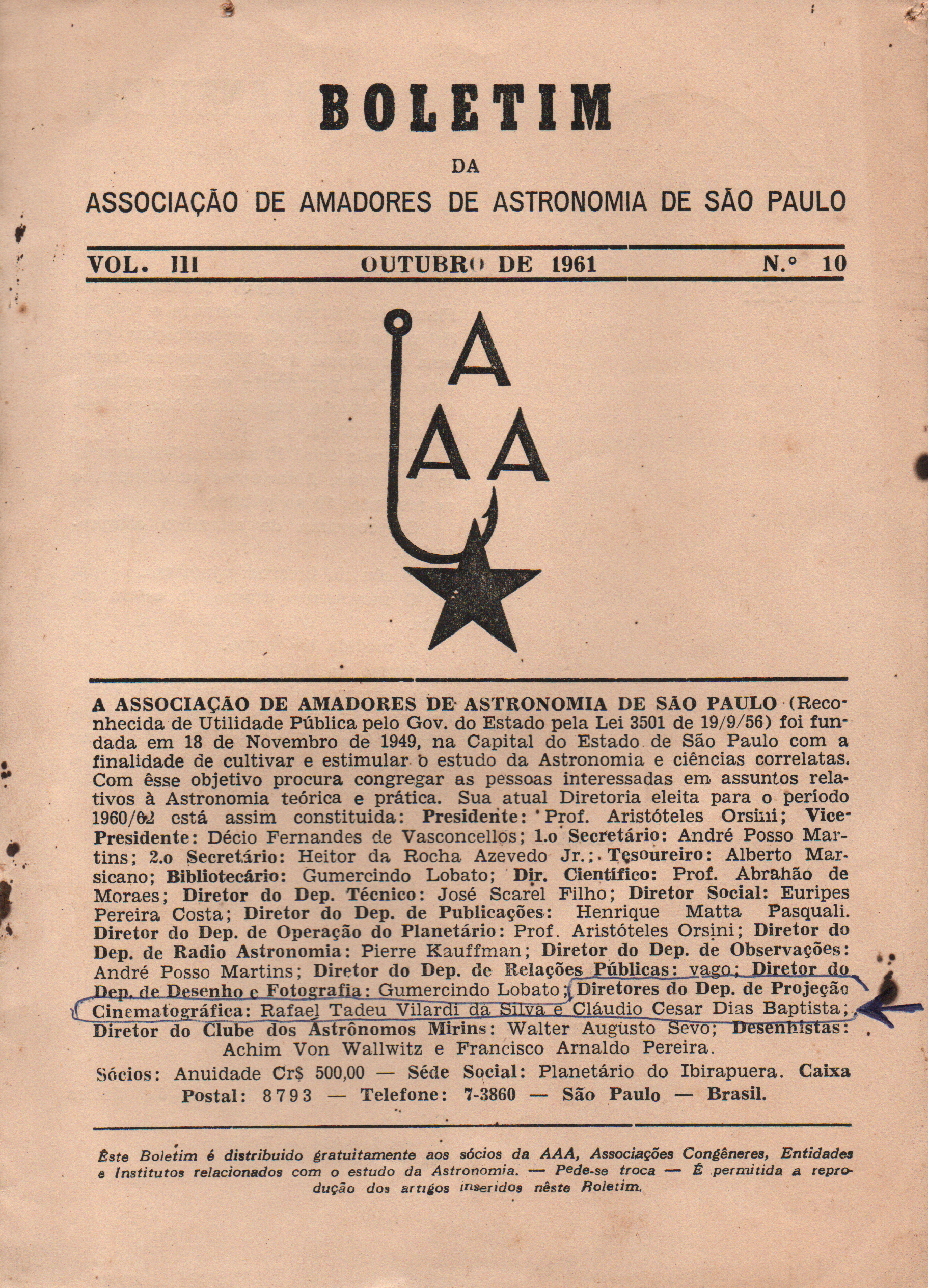 Na lista sob o logotipo da AAASP acham-se os nomes dos diretores dessa entidade; entre eles, os de Raphael Vilardi e Cláudio César Dias Baptista, fundadores e diretores do Departamento de Projeções Cinematográficas da AAASP, cuja sala de projeção montamos na Escola Municipal de Astrofísica. Os filmes científicos projetados por nós superaram em visitação as apresentações do Planetário do Ibirapuera, próprio municipal operado pelos membros da AAASP.