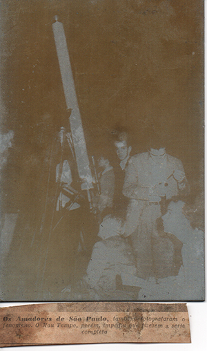 Em primeiro plano, no clichê vertical à esquerda, acha-se Gumercindo Lobato e, aos pés da luneta, Alberto Marsicano. No clichê do centro, o observador ao telescópio sou eu. Podem-se ver nos clichês vários outros membros da AAASP e do Clube dos Astrônomos Mirins (ao qual Raphael Vilardi e eu não pertencíamos, pois fazíamos parte da diretoria da própria AAASP, apesar da nossa juventude).