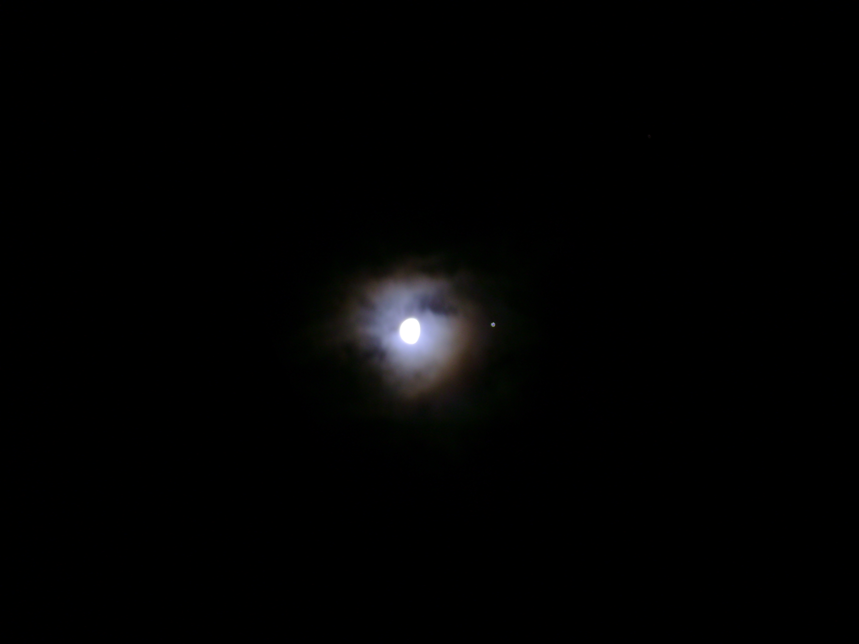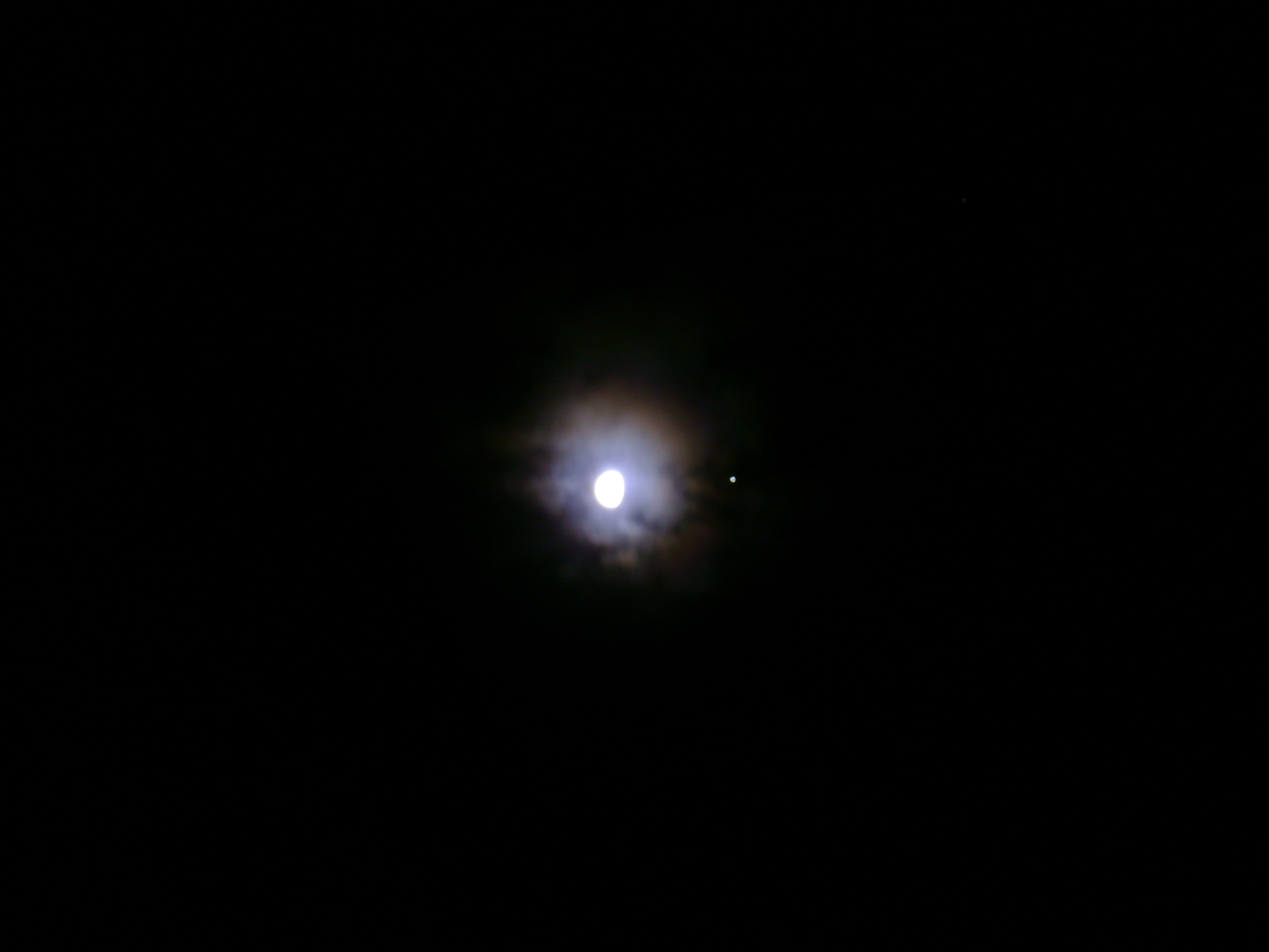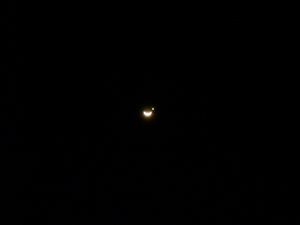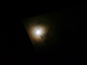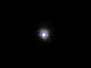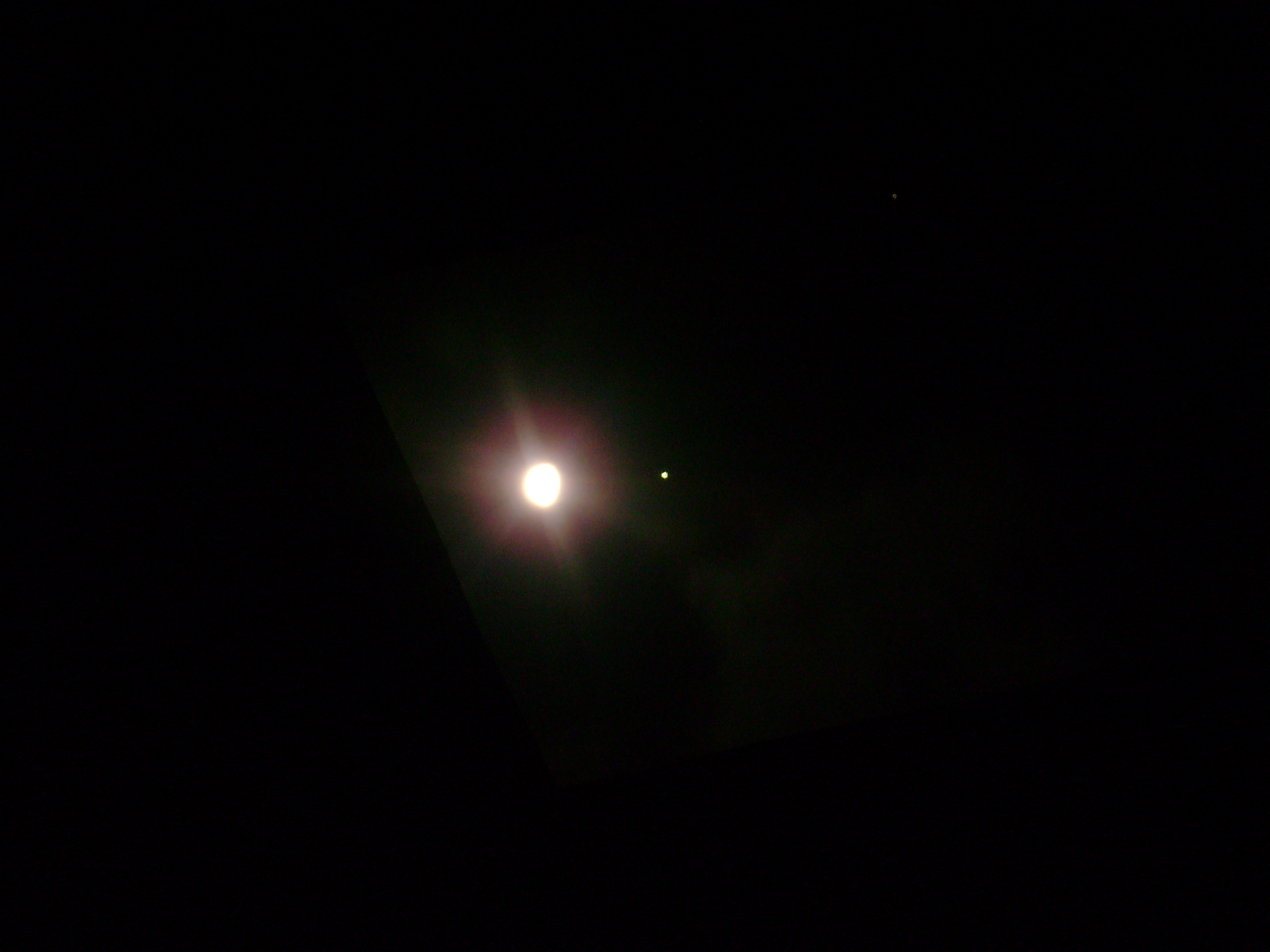 Logo acima: fotos do alinhamento entre a Lua e o planeta Júpiter batidas por mim em 21-01-2013 às 21:10 com máquina fotográfica Sony Cyber-shot 6 Megapixels e zum (zoom) óptico de três vezes, realizadas no banheiro onde se deu a Visita da Coruja. A máquina fotográfica foi um presente do Prof. Júlio Martins. Cônscio do céu, astrônomo amador, estava eu passando nu pelo banheiro quando vi, pela abertura no teto, a Lua e Júpiter em alinhamento. Peguei a máquina, o tripé e fotografei. - CCDB