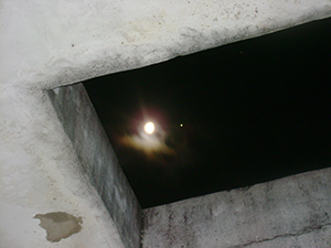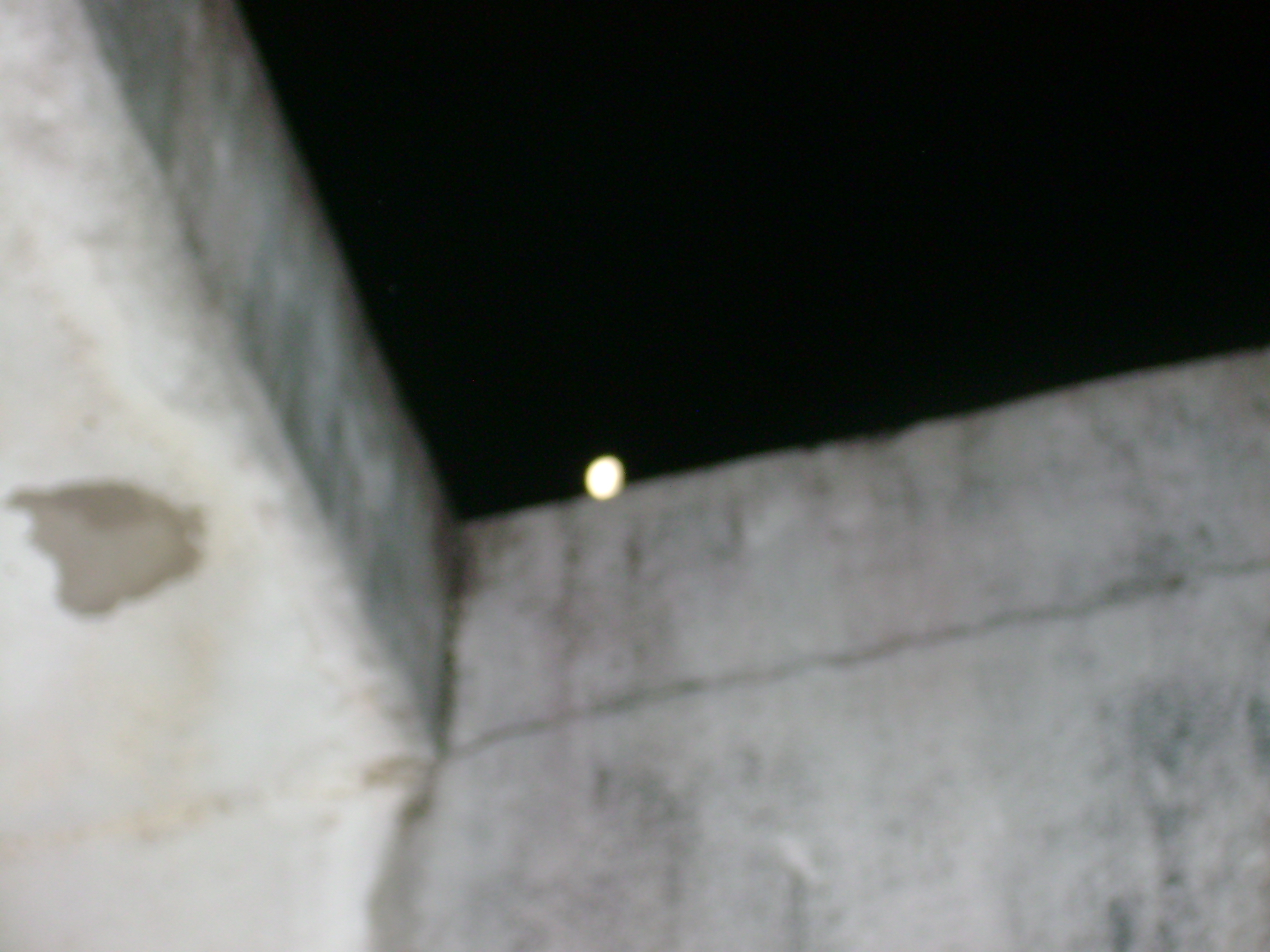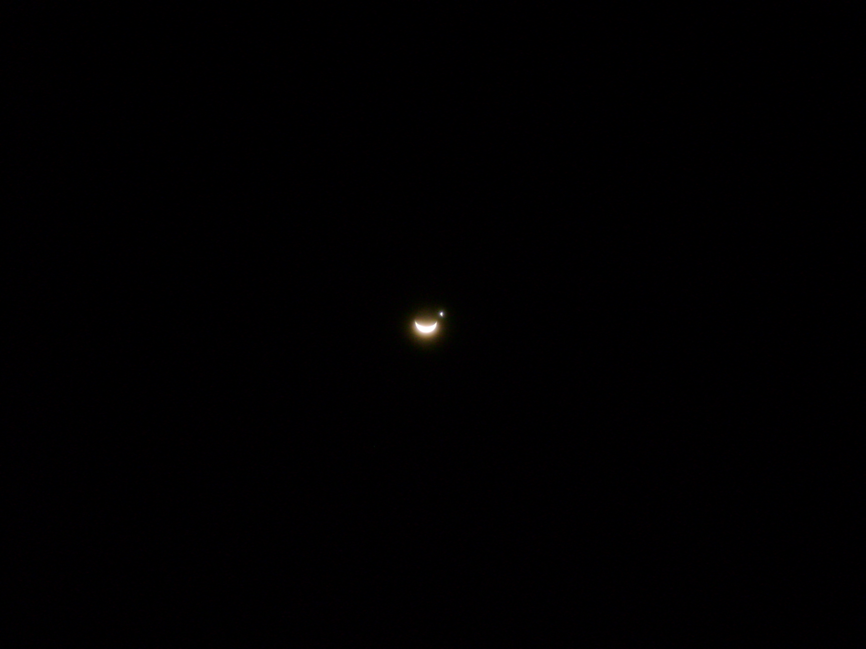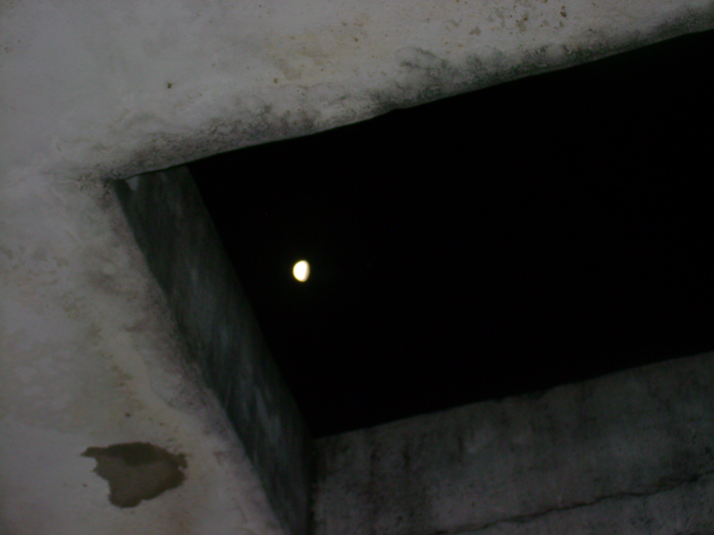 Logo acima: foto do alinhamento entre a Lua e o planeta Vênus, batidas por mim na área sobre a minha residência em Rio das Ostras - RJ em 08-09-2013 com a máquina fotográfica supramencionada. A abertura no teto do banheiro dá acesso a essa área, por meio da escada tipo Santos-Dumont que meu grande amor, Dalgiza, e nosso filho querido Rafael (RDB) construíram com suas próprias mãos. Foi por essa abertura que a Coruja nos visitou.