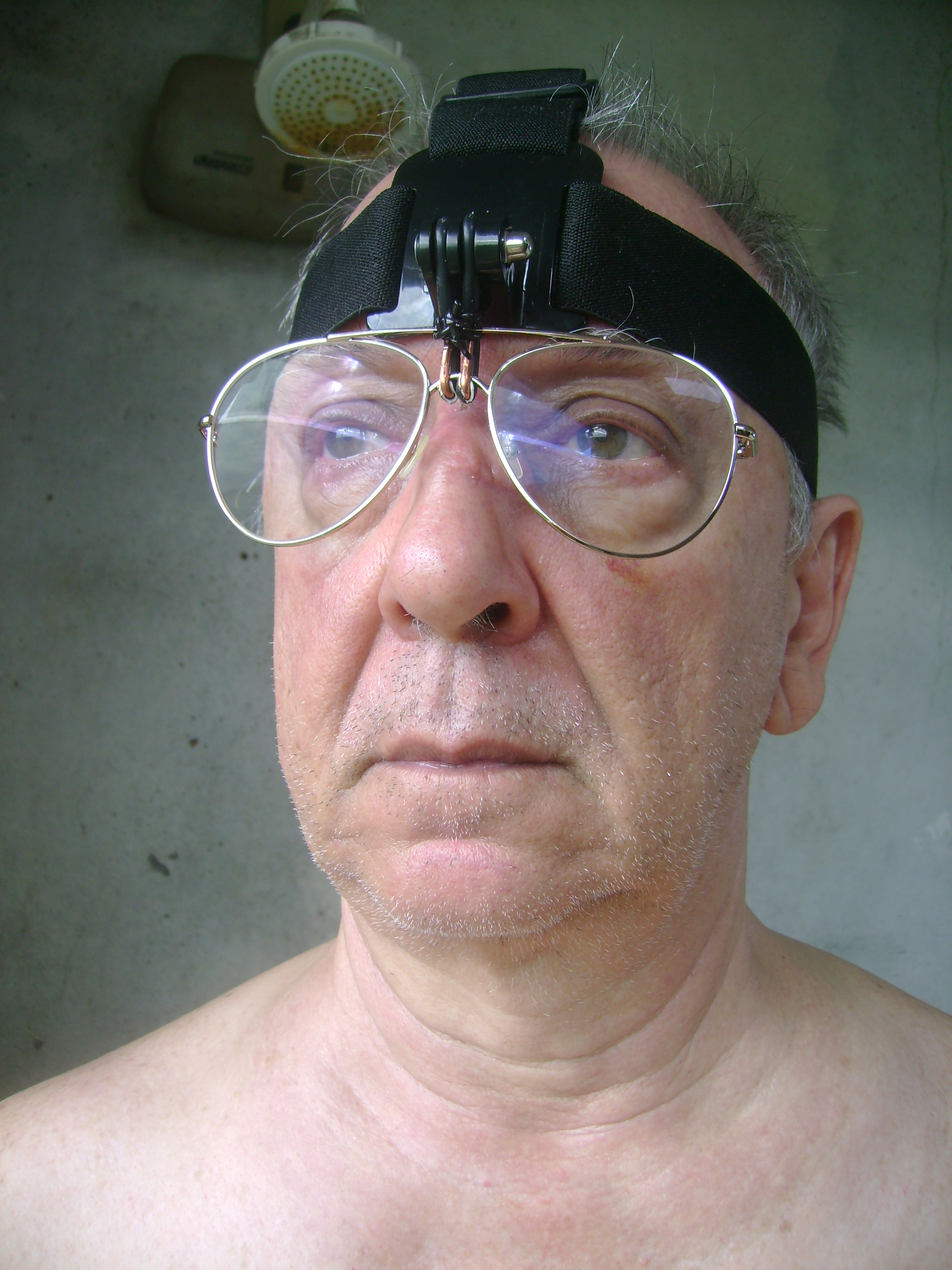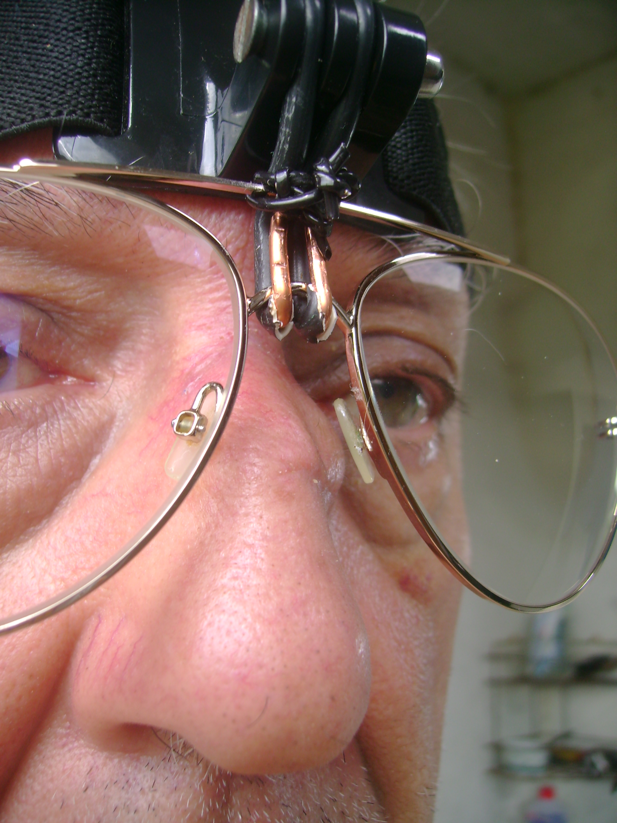 Dra. Silvana Graças dos Santos Bruno, dermatologista em Macaé - RJ, constatou-me um câncer na pele nasal, segundo ela fruto de exposição excessiva ao sol. Sub sua recomendação, procurei um cirurgião plástico oncológico, o qual me não autorizou a publicar-lhe o nome, e este me operou em 20-03-2018, no Hospital da Prefeitura de Macaé (HPM), sem anestesia geral nem internação obrigatória (como é péssima praxe no SUS), só anestesia local. Ele trabalhou circundado de cinco estagiárias atentas e atenciosas. O ato cirúrgico foi fotografado pelo cirurgião (cujas fotos não me disponibilizou) e me senti honrado em ser útil ao estudo das estagiárias. Eles todos não sabem quem sou: trataram-me assaz bem, uma pessoa qualquer do povo. Apesar do diagnóstico da dermatologista e do cirurgião, que atribuíram à radiação solar a origem desse câncer, na minha perspectiva ele foi ao menos ativado, se não causado, pelo contato e a pressão das plaquetas dos óculos mencionados no título logo acima, apesar das modificações que neles pratiquei, vistas na página do link "aqui". Eis logo abaixo três fotos, batidas por Dalgiza, do resultado da cirurgia e de um dispositivo que inventei para sustentar tais óculos, com as já lendárias lentes Zeiss "Superb", fixados a uma faixa "Head-Strap" derredor de minha cabeça. Seria útil os fabricantes de óculos fornecerem dispositivo similar (não cobrarei royalties pela invenção), mais bem apresentado e funcional, para a suspensão de quaisquer óculos convencionais, evitando-lhes o toque na pele nasal. Aproveito para informar: conquanto mostrem nas fotos do "Head-Strap" um parafuso plástico, este não vem junto com a faixa; é preciso comprá-lo à parte ou utilizar um parafuso adequado à rosca existente no suporte, como fiz. A visão pelos óculos não foi prejudicada e continuo apto a compor música, criar animações e atender aos Leitores e Leitoras em CCDB Livros!