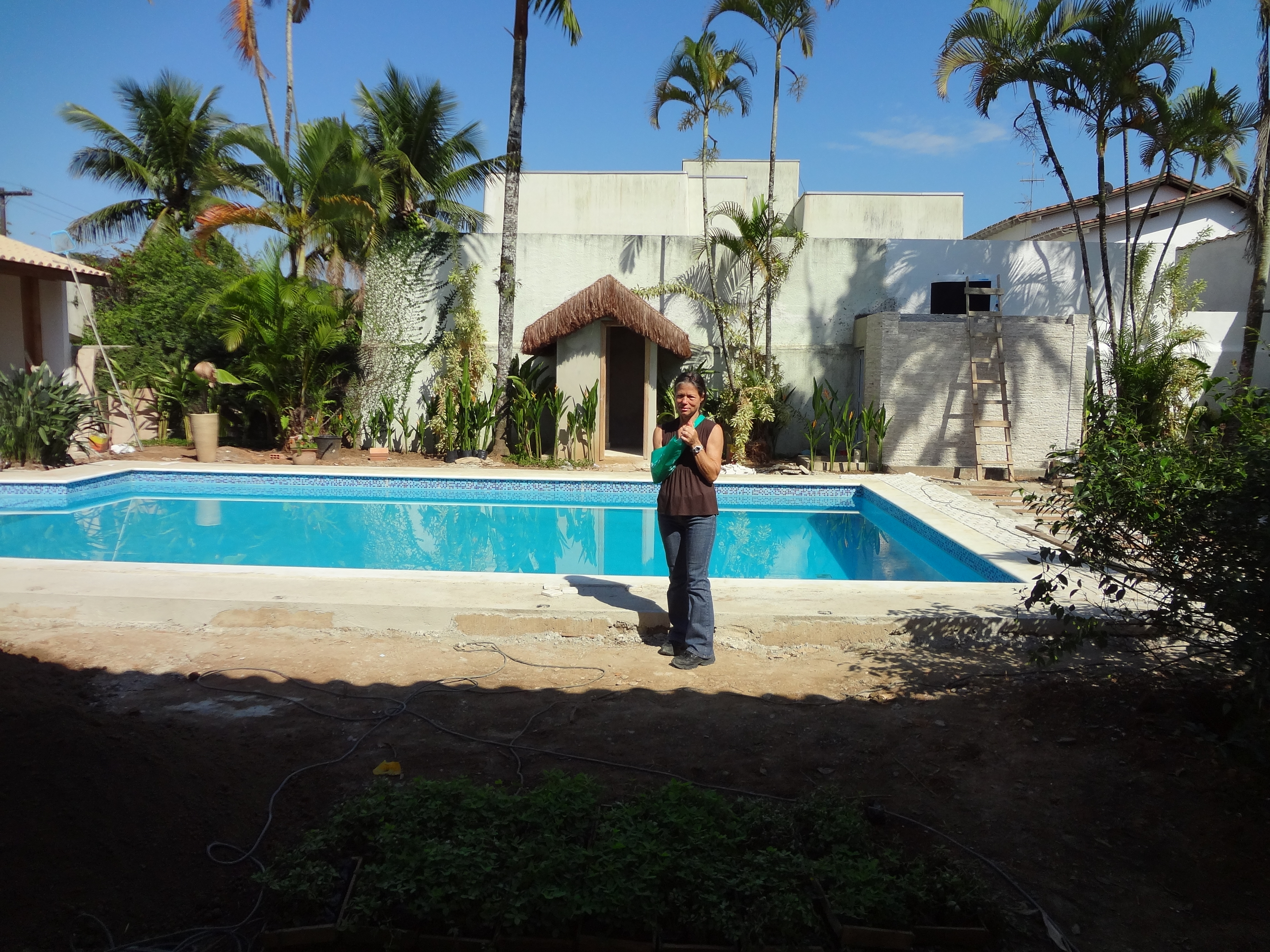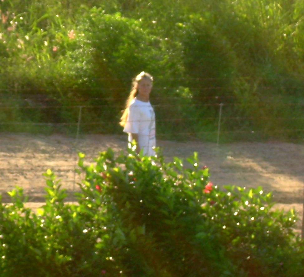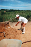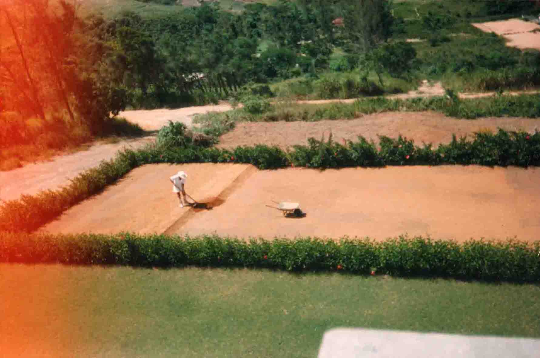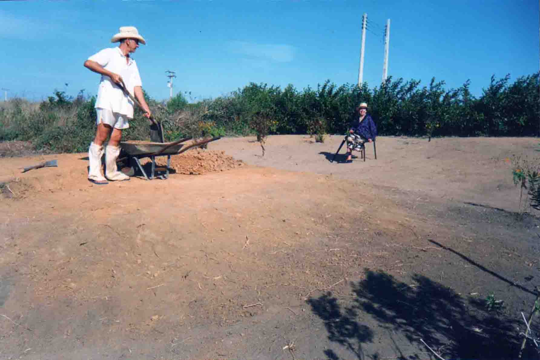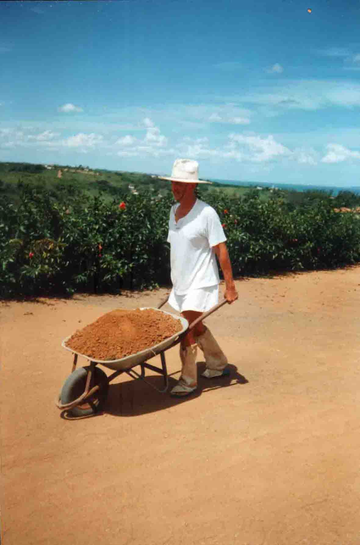 CCDB aplaina a terra recém-descarregada no Lote 3. O gramado do Lote 4 está visível na parte inferior da foto. A cerca viva de hibisco, plantada por Dalgiza à volta toda dos lotes de terreno, será retirada de entre os lotes 3 e 4, quando o aterro do Lote 3 estiver terminado. Dessa cerca restará apenas a planta acenosa que CCDB denomina de "Kyhibisco" (Alma Única dos Hibiscos), a qual lhe comunicava força com seus gestos peculiares (mesmo quando não parecia haver qualquer vento...), todos esses anos durante o labor. Até hoje o Kyhibisco vive e tornou-se quase uma árvore, cercada de roseiras no gramado. Ao fundo, o rumo norte.