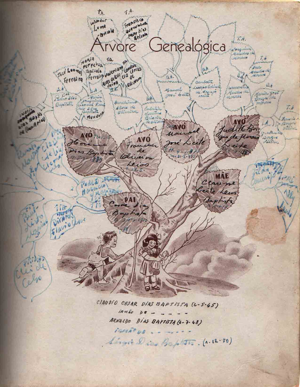 FONTE: ÁLBUM DO BEBÊ CLÁUDIO CÉSAR DIAS BAPTISTA, EM POSSE DESTE, MANUSCRITO PELO PRÓPRIO CÉSAR DIAS BAPTISTA; MORTE DE CÉSAR DIAS BAPTISTA ANOTADA POR CLÁUDIO CÉSAR DIAS BAPTISTA NO MESMO ÁLBUM E NASCIMENTO DE CLARISSE LEITE, INFORMADO EM DADOS PÚBLICOS NA WEB.