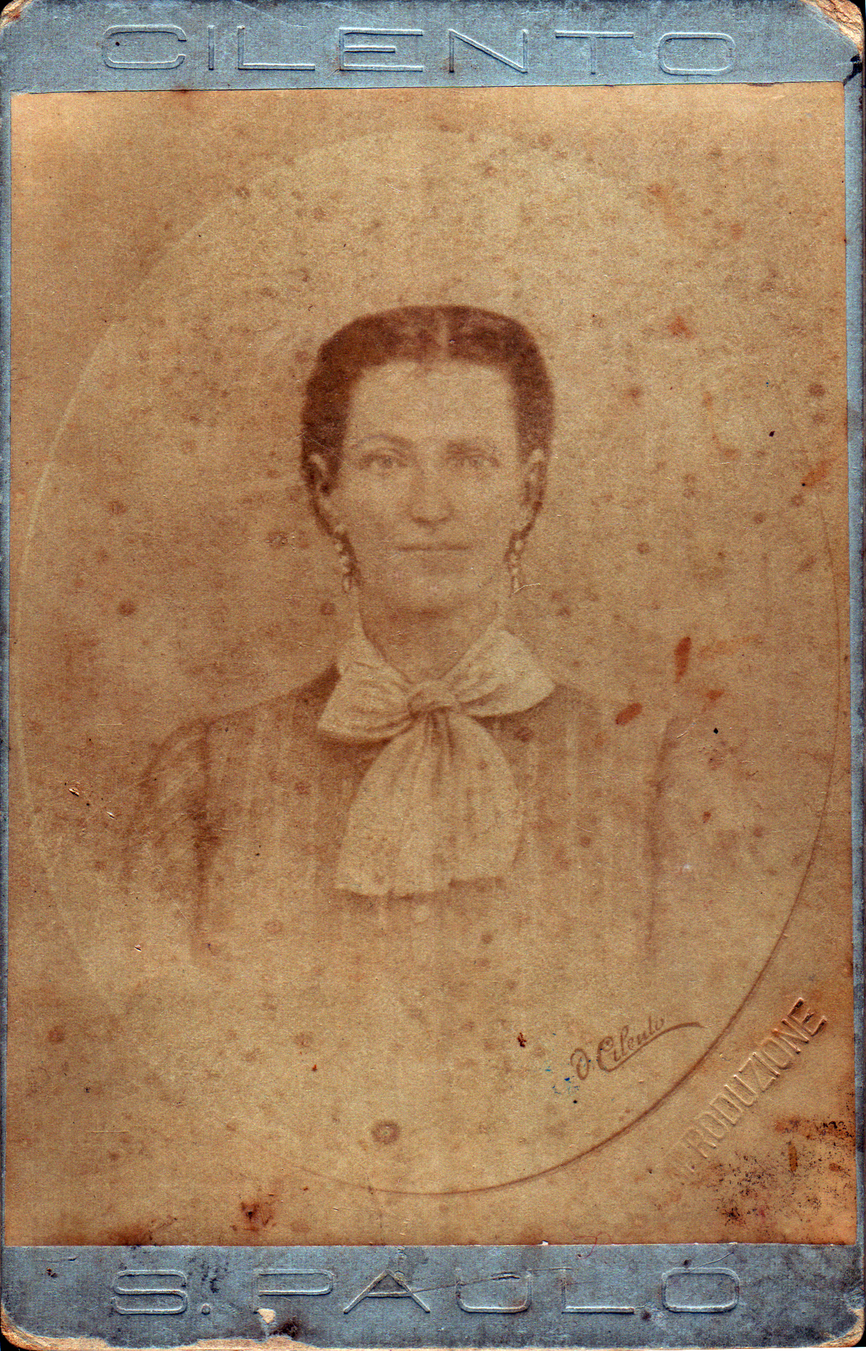 Na foto acima, temos Carlota Leopoldina de Araujo Leite, minha bisavó pelo lado materno. Você pode ver essa mesma foto com máxima resolução (JPG 3,77MB) se clicar sobre ela. Carlota foi filha do capitão Joaquim Carlos de Araujo e Florisbela Fulgara de Araujo. O pai de Carlota foi capitão de uma nau particular, a primeira, a vapor, que atravessou o Atlântico, segundo minha mãe, Clarisse. Ainda segundo Clarisse, o nome da nau era Itambé, cuja miniatura está exposta no Monte Serrat, em Santos. Os corpos do capitão e da esposa acham-se enterrados sob as lajes da Matriz de São Vicente. Quando atravessava o Atlântico, desencadeou-se uma tempestade e o capitão Joaquim fez o voto de, caso chegassem todos a bordo com vida ao Brasil, doar as duas imagens que trazia consigo à Matriz de São Vicente. Assim o fez. As imagens estão nessa matriz e são de Nossa Senhora das Dores e de Nosso Senhor dos Passos.