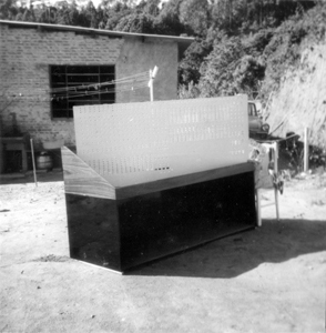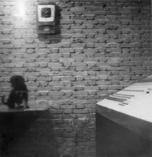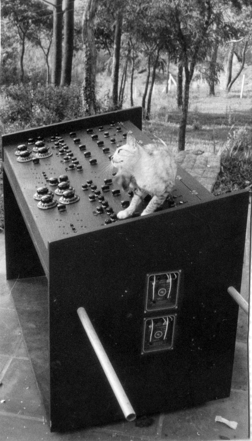 Eis a mesa de som tetrafônica, montagem terminada (1972). Foi a primeiríssima a ser posta no meio de uma platéia no Brasil. Era operada por CCDB, o primeiro operador de áudio a colocar e a operar mesa de som instalada em meio a uma platéia neste país. Sob a direção de CCDB, Pena Schmidt operava o misturador do som do palco. A gatinha sobre a mesa, que nunca aceitou batismo, apareceu em casa e ficou morando coa família até que, num parto difícil, passou pela transição inda mui jovem. É uma das grandes amigas que CCDB deseja rever, quando as órbitas que vai acumulando ao redor do Sol o centrifugarem para o Além...