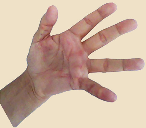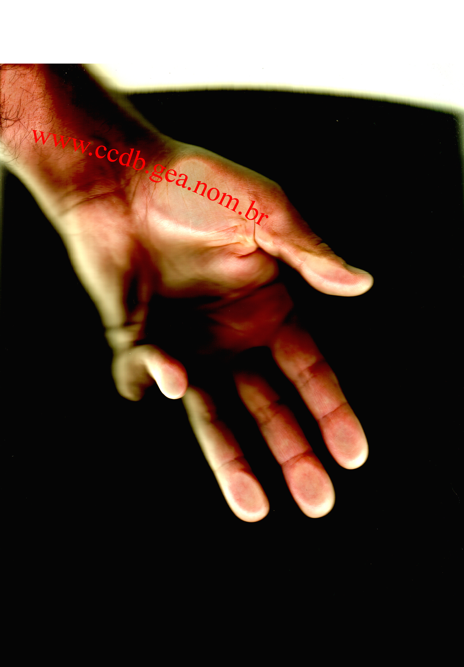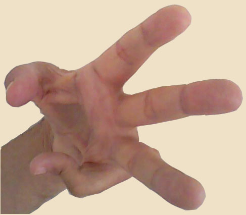 A imagem à esquerda é da minha mão sinistra. Trata-se de um scan que eu próprio fiz, quando minha mão esquerda inda podia se espalmar até certo ponto, o bastante para ser escaneada, isso porque eu não tinha máquina fotográfica apta a mostrar como a mão se achava na época.