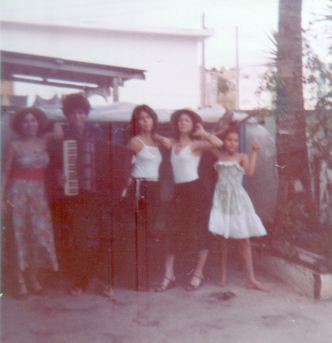 Em segundo plano, mesmo sentido, Carminha, filha de minha tia Carmen e seu marido Sérgio Camargo (em quem baseei o personagem Tio Sérias, para a obra Géa), e inclinado, no centro da imagem, meu irmão Sérgio (o guitarrista).