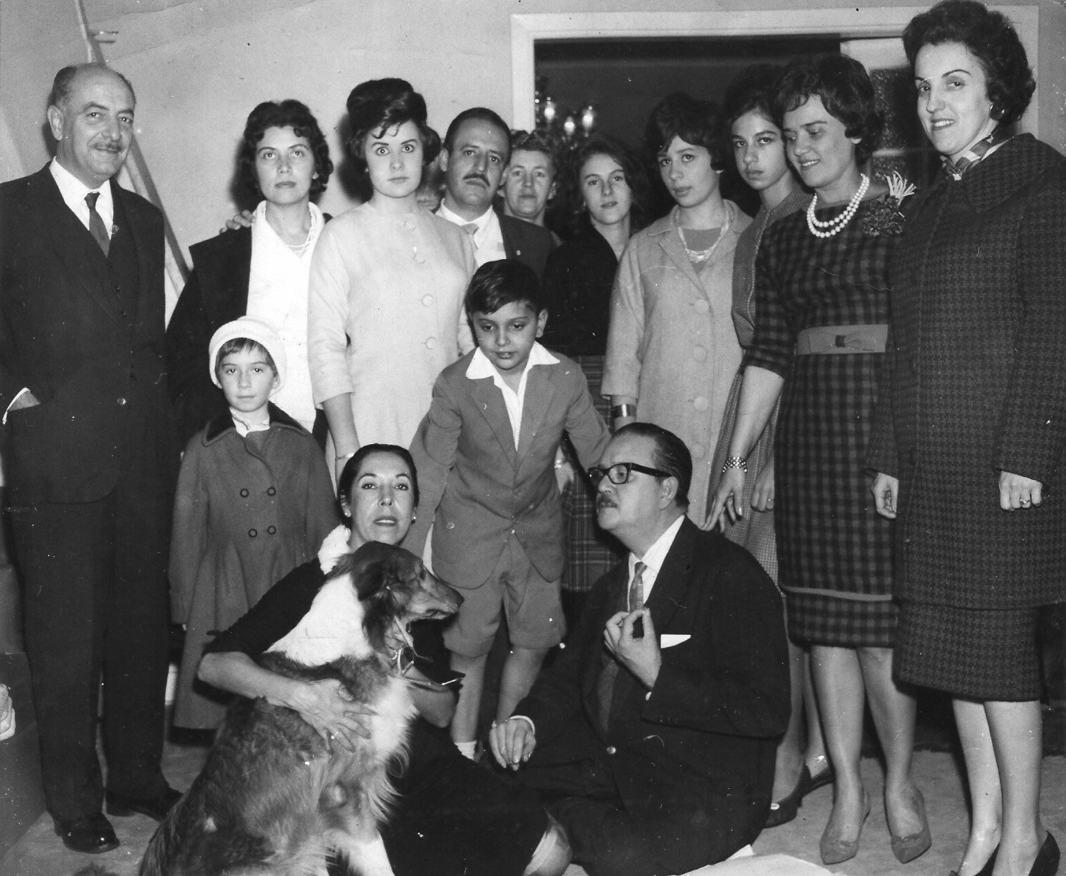 Na foto, em primeiro plano, da esquerda para a direita: minha mãe, Clarisse, abraçada à cadela Lassie; e meu pai, César, de óculos.