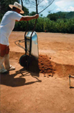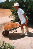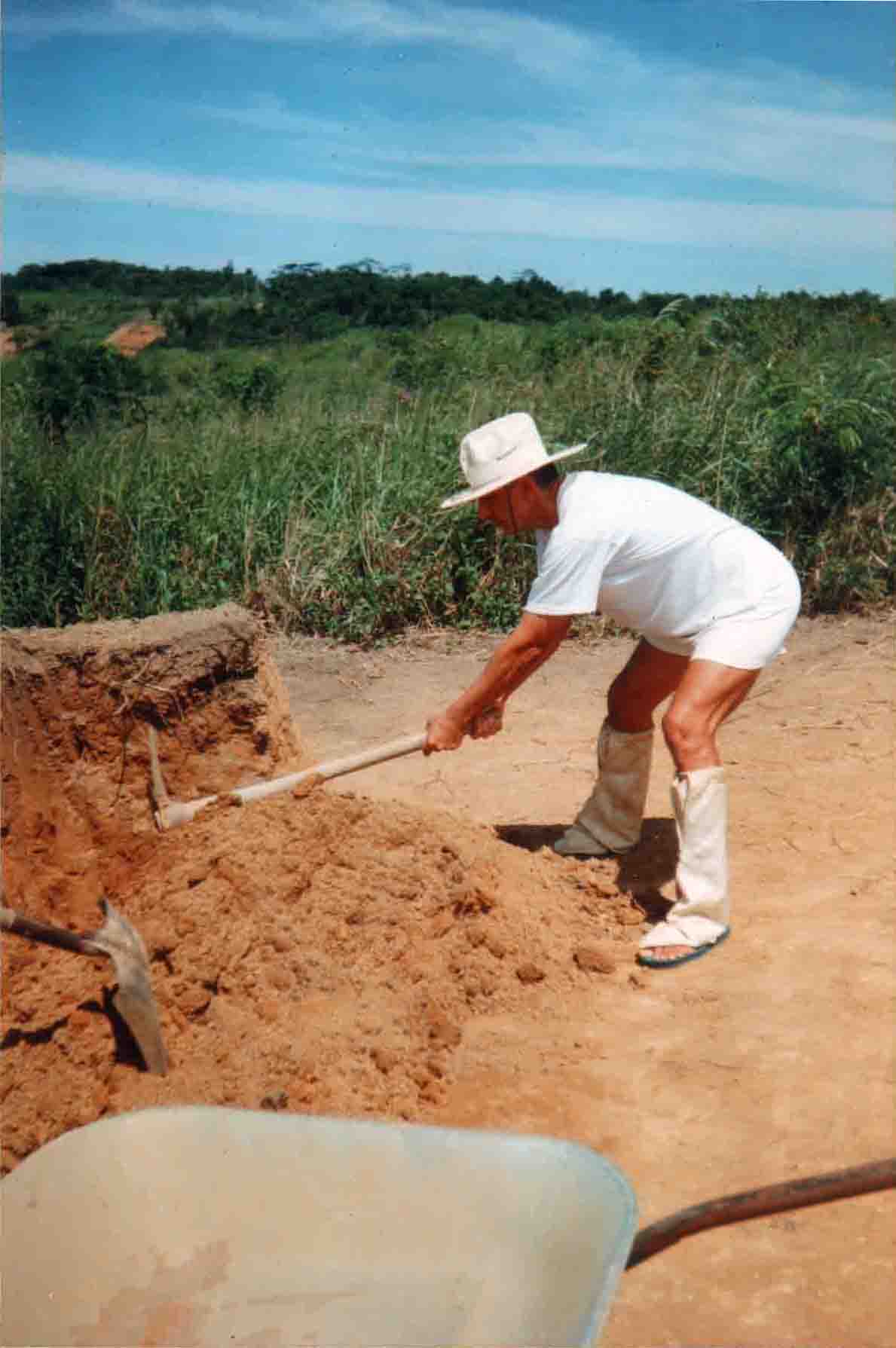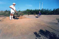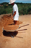 CCDB enche o carro de mão com a terra que levará para um dos lotes de terreno, a ser aterrado para o então futuro gramado.