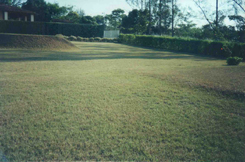 Enfim termina a plantação do gramado, que já cobre o Lote 3. Vemos o Kyhibisco, inda jovem, à direita, cercado pelas pequenas roseiras. À esquerda, no alto, vemos a Praça Tóxia, lugar onde o disco voador invisibilizado Laranja se mantém a flutuar, quando Clausar e os seus vêm à Terra em visita a CCDB e sua família. Neste site há ilustrações onde a Praça Tóxia correspondente, no planeta Géa, pode ser vista e com a Laranja a lhe pairar por cima. Ao fundo, o horizonte sudoeste e o portão de entrada da casa, cuja frente principal se volta para o oeste, mas cuja vista para o mar se acha no rumo oposto. Nem um pedaço da casa da família aparece na foto: ela se acha inda mais à esquerda - o telhado visível pertence à casa de um vizinho. Você pode ver a casa de Clausar, muito parecida com a da família CCDB, Dalgiza e RDB, nas ilustrações de Géa e de Geínha.
