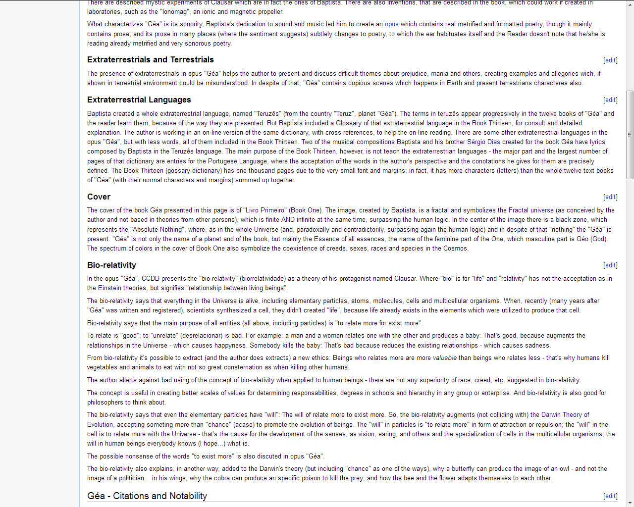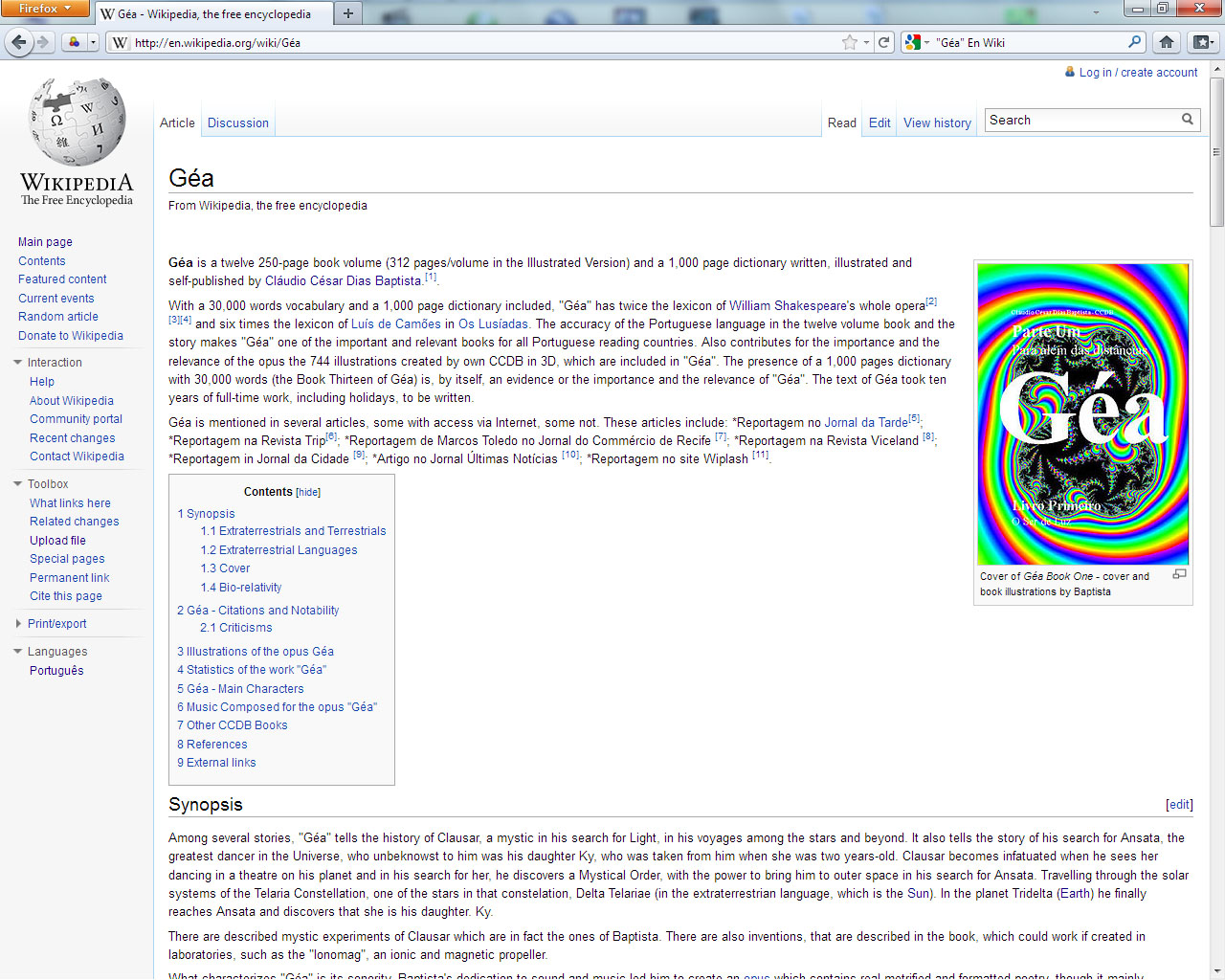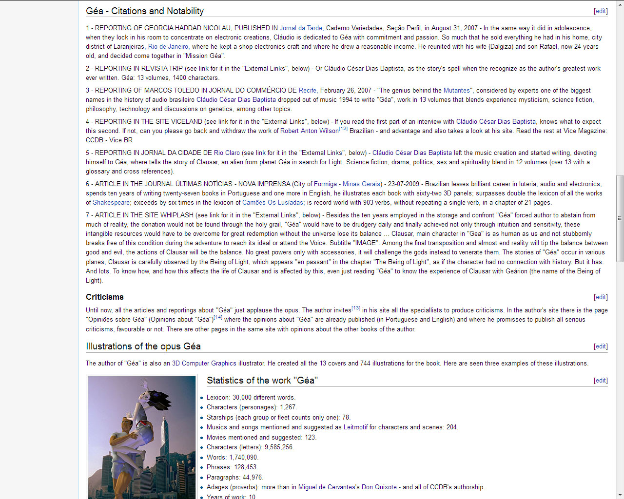 DISCUSSÃO NA EN WIKI QUE RESULTOU NO APAGAMENTO DA PÁGINA “GÉA” ===[[Géa]]=== :{{la|Géa}} – (<includeonly>[[Wikipedia:Articles for deletion/Géa|View AfD]]</includeonly><noinclude>[[Wikipedia:Articles for deletion/Log/2011 June 10#{{anchorencode:Géa}}|View log]]</noinclude>) :The article [[Géa]] and the page [[Cláudio César Dias Baptista]] which En Wiki members considered at first good to be published here are suffering a political attack from the En Wiki member named Antiuser.[[User:Cláudio César Dias Baptista|Cláudio César Dias Baptista]] ([[User talk:Cláudio César Dias Baptista|talk]]) 16:03, 10 June 2011 (UTC) * '''delete''' It's very long, but that doesn't convey notability and not much else is seeming to. Besides, any book with a technicolour fractal on the cover and that isn't by Mandelbrot or similar should be burned. [[User:Andy Dingley|Andy Dingley]] ([[User talk:Andy Dingley|talk]]) 16:04, 10 June 2011 (UTC) ::**'''Anyone''' who says that any book should be burned should be burned him/herself.[[Special:Contributions/187.14.113.31|187.14.113.31]] ([[User talk:187.14.113.31|talk]]) 16:17, 10 June 2011 (UTC) As you see, dear Daniel, Andy is insisting in his childishness. You have a clearer mind, please read again the article and consider the sources mentioned there as the importance they really have in Brazil and Portuguese language countries. The book is great, I've read it! You can read it too, in www.ccdb.gea.nom.br, as I see by your phrase 'Portuguese language sources are a little hard to sort out'; so, you can read Portuguese to judge the quality of these sources and, so, you can also read the book! If you like Portuguese language, you will love to read the book as I did and, perhaps, as myself, learn a lot of that great language - there is no better source today, and the book [[Géa]] includes a thousand page dictionary also delightful to people who love Portuguese language. If not by the language, the lexicon twice William Shakespeare, you may be perhaps enchanted with the histories inside the twelve volumes of the book. Regards[[Special:Contributions/187.14.112.27|187.14.112.27]] ([[User talk:187.14.112.27|talk]]) 17:43, 10 June 2011 (UTC) **'''Do not delete''' - Let's be rational and cool, analyzing the page. Here are the positive points: The author invested more than ten years of his life in writting a book, moreover, a twelve 250 pages volume book. The author composed a 1,000 pages dictionary to complement the book. The author utilized a lexicon twice the William Shakespeare lexicon in his whole opera and six times the lexicon of Camões in "Os Lusíadas". The author created a new language with extra words, doesn't matter if it's named an 'extraterrestrial language' or not. The author illustrated himself the twelve volumes with more than 700 3D pictures, so, he had to learn 3D Computer Graphics to do these illustrations and also the thirteen covers for [[Géa]]. The author studied programming languages for computer to create himself the active pages in a site also created by himself to publish himself the book. The author applied his audio experience to perfection the sound of the reading. The author wrote also metrified poems inside the book. The author of [[Géa]] composed music for the book. The author proposed complete inventions in the books which could work if tested in laboratory. The author abandoned his profitable carreer in audio to write the book. The author created more than one thousand characters for the book. The description of these characters is interesting in the page [[Géa]]. The author presented a Theory, the 'biorrelatividade' in the book. The stories presented in the page are captivating for people who has the habit of reading books - at least they captivate myself. The quantity of references is more than enough and the quality of some of these references is unquestionable, as it's the case of the reporting in [[Jornal da Tarde]], in the Revista Trip (very important in Brazil). And here are the negative points: The book is written in Portuguese, not yet translated to English; Brazil is not England nor USA; people who see the page [[Géa]] here in En Wiki can't easily judge the merit of the book because they can't read it. Now I ask myself: Are those negative poits really negative? Is not perhaps an injustice being done against a perhaps great work as it was done also against [[Don Quixote]] of [[Miguel de Cervantes]] and so many great books which were recognized long time after their writting? Or as the pictures of [[Vincent van Gogh]], who sold only one of them during his life and which were recognized so late? If you search En Wiki for pages about other books, you will see that very few, if any, has the merits I mentioned above for the book [[Géa]]. So, I am forced to conclude that the cause of the deletion proposal is not the lack of importance of the opus, but another unknown cause, external to the page itself. And I don't want to be one of the persons who will be remembered as the ones who deleted the page of a book that shows everything to be perhaps recognized as a great work. I vote for the permanence of the page in En [[Géa]] in En Wiki.[[User:William T. Johannes|William T. Johannes]] ([[User talk:William T. Johannes|talk]]) 02:53, 11 June 2011 (UTC) :: ' ''The author invested more than ten years of his life in writting a book'' ' : '''Do not delete, please''' - I would ask them not delete nothing in the text. If it is a text that talks about a book or author is a way to have thorough research on it.I read the book [[Géa]] and I found everything the article written here on En Wiki informs thus removing some of the text as it would erase part of the book and the story of the author. Any of you ever read a book and thought the best part of the book, the pages are blank? That's what I imagine to deleting some of the text that refers to something, like we're erasing part of it. I ask you to please leave the full text 