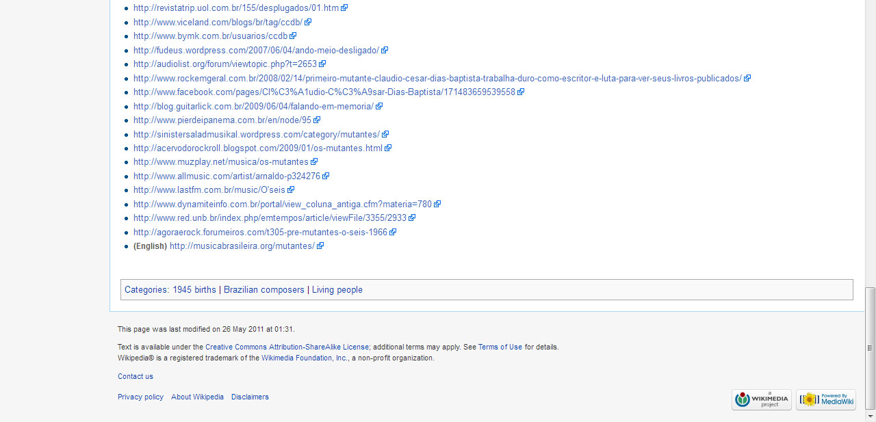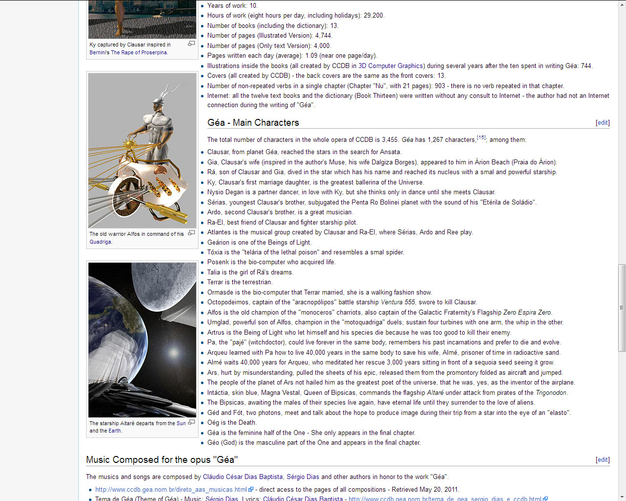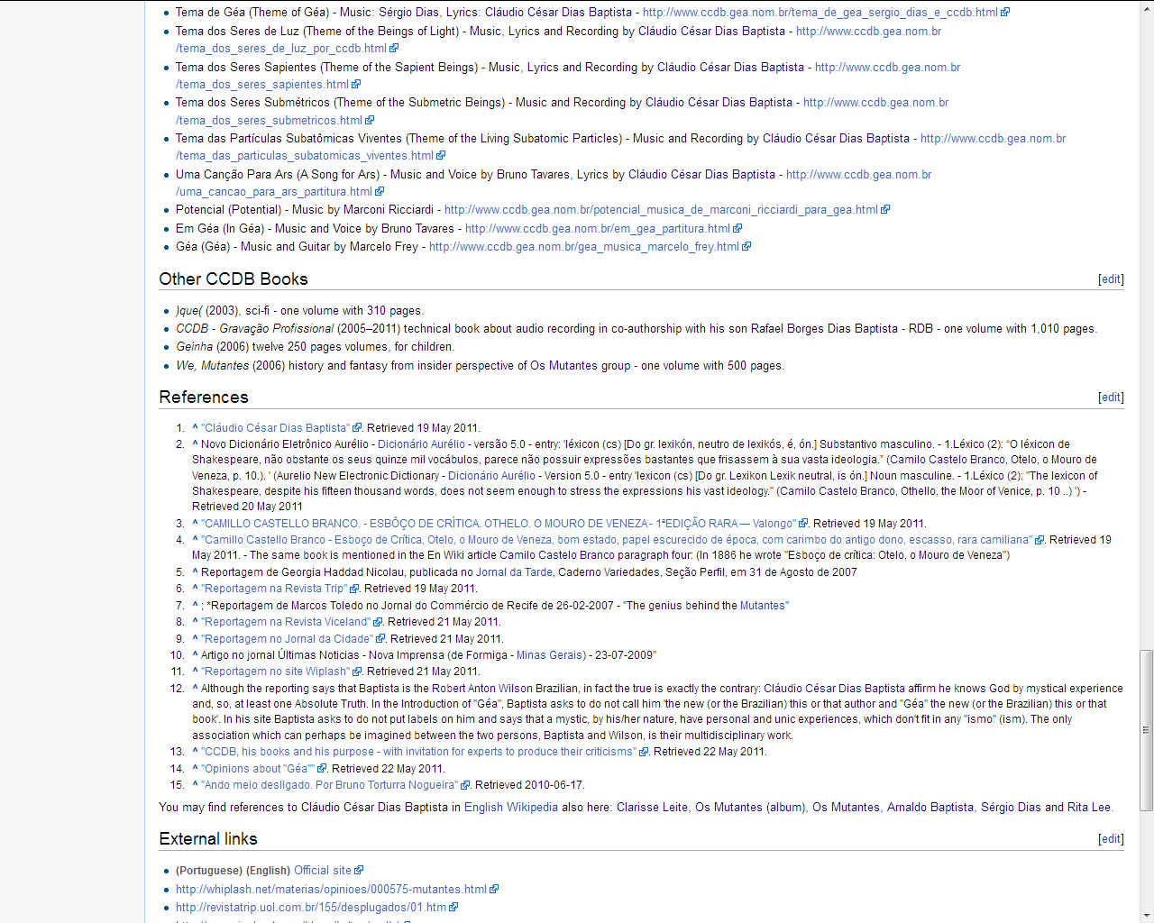 APAGANDO A HISTÓRIA DO BRASIL Um dos brasileiros que atacaram as páginas “Géa” e “Cláudio César Dias Baptista” na English Wikipedia (En Wiki) apagou nas páginas “Os Mutantes”, “Rita Lee” e em todas as páginas dos álbuns dos Mutantes (que permanecem na En Wiki) a seguinte parte da história do conjunto que Raphael Vilardi e eu criamos (eis a cópia do código-fonte da parte apagada): "The musical instruments of Os Mutantes, as the Golden Guitar (Guitarra de Ouro) and special sound effects and pedals, as the sewing-machine motor effect in the song "Bat Macumba" and the Guitar Synthesizer Sérgio played in Tudo Foi Feito Pelo Sol were all created by [[Cláudio César Dias Baptista]] - CCDB, the elder brother of Arnaldo and Sérgio. With Raphael Vilardi, Cláudio founded the musical group "The Thunders", first of all groups which resulted in Os Mutantes. The Golden Guitar (Guitarra de Ouro) can be heard in the "Os Mutantes" album and in many other albums of the same group. Today Cláudio is best known as a writer, author of the opus [[Géa]] (with twice the lexicon of [[William Shakespeare]] whole opera) and several other books, but he still helps Os Mutantes furnishing circuit information to the new guitars of [[Sérgio Dias]]." Na página “Rita Lee” o parágrafo apagado mencionava também o teremim que para ela criei e a minha participação no LP “Hoje é o Último Dia do Resto da Sua Vida”, em que toquei zabumba, fiz comentários que se ouvem na gravação, LP esse cujo “som” (como está escrito na capa do LP e no folhedo do CD) foi de minha autoria. É proibido ter léxicon duas vezes o de William Shakespeare na En Wiki. É proibido ser escritor quando se é um dos Mutantes. Não “é proibido proibir” na En Wiki. Pergunta: eu me tornei persona non grata à En Wiki por causa desta página (a que você lê agora) e destas outras páginas (CCDB na Pt Wikipédia e CCDB na Pt Wikipédia versão antiga) em meu site e por esse motivo meu nome e obra são apagados lá? Ou esta página (a que você lê agora) e as páginas dos links acima nasceram depois que brasileiros atacaram as páginas Pt Wiki e da En Wiki onde meu nome e obra apareciam e minha história era contada, parte da História do Brasil que tais brasileiros apagaram? - CCDB 19-06-2011.