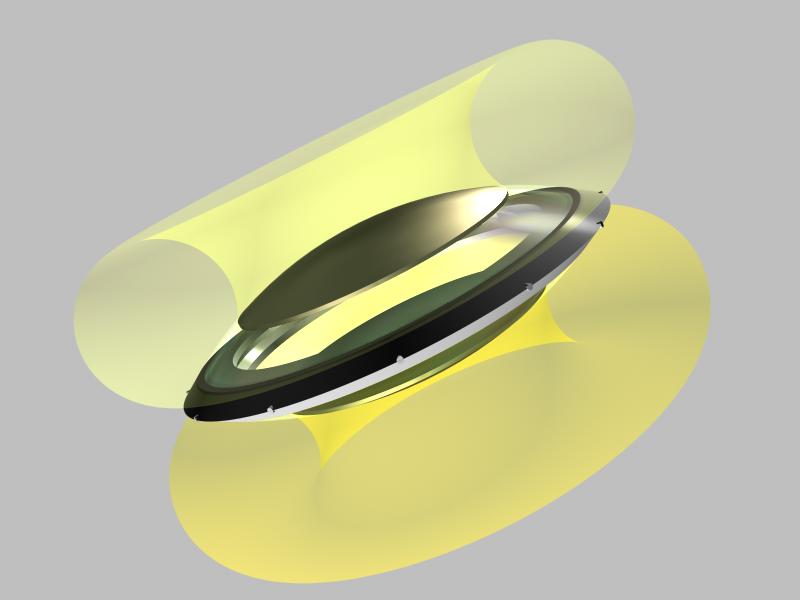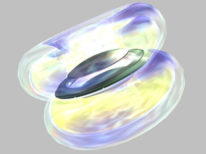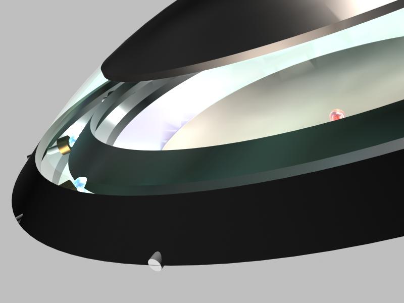Na figura abaixo vemos a Laranja com os iônelos e o campo magnético. Apenas os campos magnéticos foram desenhados com menos faces, para facilitar a comparação da qualidade das figuras desta página com a das figuras mais simples das outras páginas deste site que tratam dessa nave.