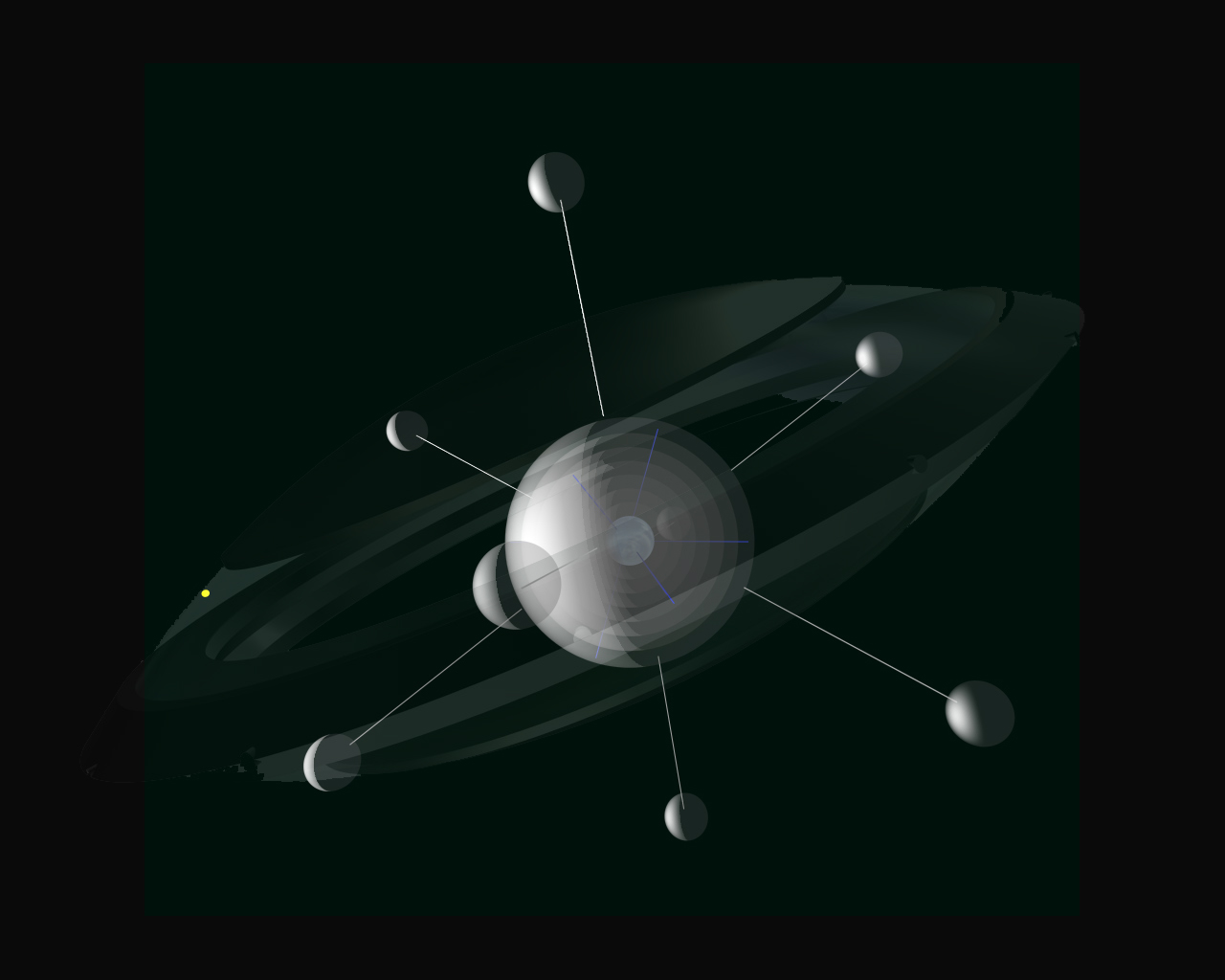 Na figura abaixo, vemos a Laranja aproximando-se de Penta Ro Bolinei, sob o comando de Rá, o enkinho, enquanto se vai invisibilizando com seu recurso chamado "refrator". Essa imagem foi obtida pela bio-computadora da nau do Galáctico terráqueo Terrar. Se não distinguir a nave entre as nuanças de Penta, aumente o brilho (bright) em seu monitor, por gentileza.