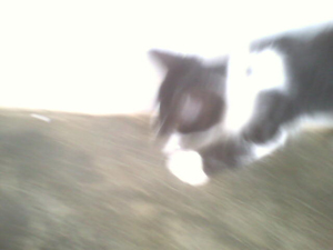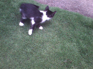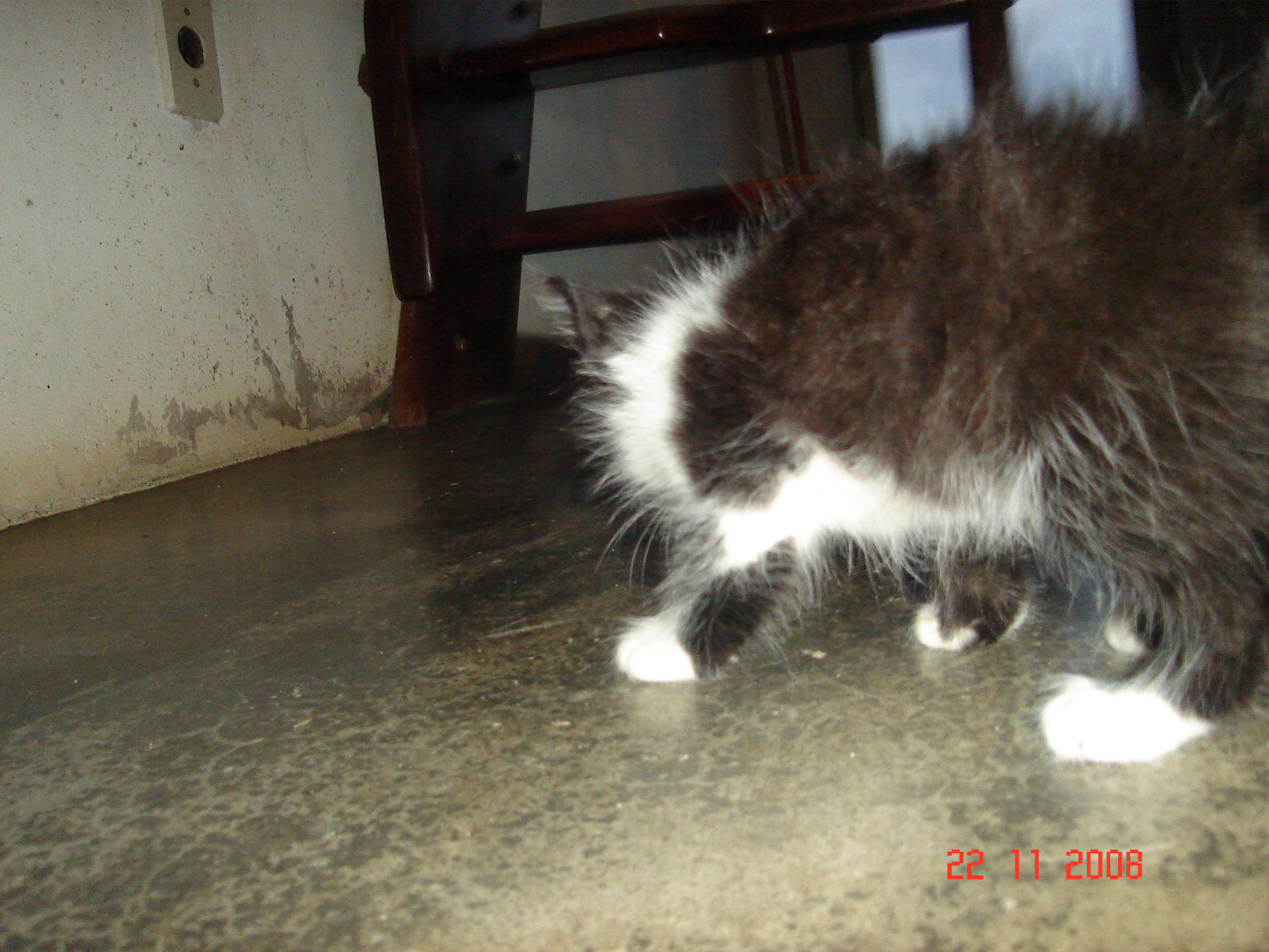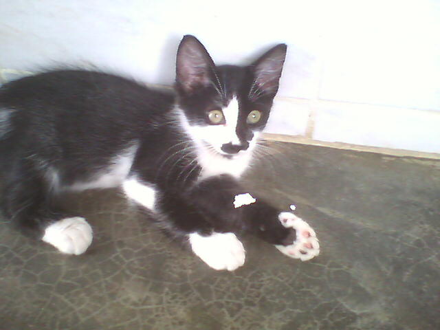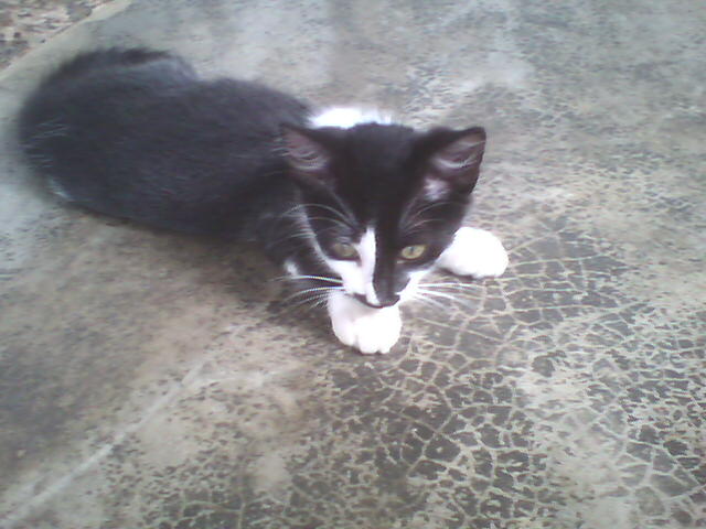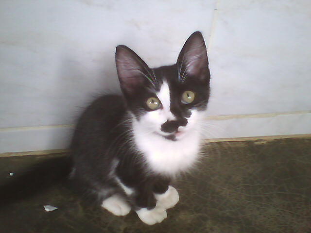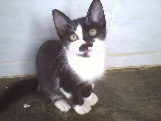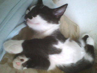 Kimê não é filho de Minhé. Kimê foi abandonado, mui novinho, na porta de uma loja de animais. Como era demasiado jovem para a loja poder recebê-lo e pôr no mostruário para dar grátis a quem o quisesse, uma senhora bondosa que fornece gatos a essa loja o levou para casa e cuidou até que crescesse o suficiente para ficar na loja à espera de quem o quisesse. Quando a senhora o entregou à loja foi que RDB lá o viu. Meu filho contou a Dalgiza sobre o gatinho.... e Giza foi buscá-lo na loja. Ele inda era bem bem bem pequeno (como se pode ver nas fotos de 22-11-08, acima) e, mesmo assaz bem cuidado, quase morreu de algum tipo de gripe, tendo de ser levado ao veterinário, que o conseguiu curar. Hoje vive conosco e é, de longe! o mais "inteligato" que já conheci... Somos felizes até com os incontáveis arranhões que seu treinamento para luta nos põe nas mãos, nos braços e nas pernas - embora ele se esforce em recolher as garras afiadíssimas... Entende todos os sinais de mãos, olha para aquilo que apontamos, utiliza as patas para segurar comida e terrina, transporta objetos na boca, testa coisas desconhecidas com as patas antes de meter o nariz, vem quando a gente o chama, gosta emocionadamente de nós três. Nunca vai ao pratinho de ração sem antes nos vir cumprimentar, mesmo quando já há ração nesse prato. Mostra-se extremamente grato, reconhecido mesmo, por o termos trazido para viver conosco. Talvez ele resuma em sua "vira-latice" tudo de bom que há nas raças puras. Quem sabe o preto-e-branco de sua camuflagem seja sinal de inteligência; pois não é dessa mesma cor o cão mais inteligente deste planeta, um pastor escocês? Ou será Kimê um elasto, presente geóctone descido da Laranja para a Terra nalguma noite escura, como a daquele já famoso apagão?